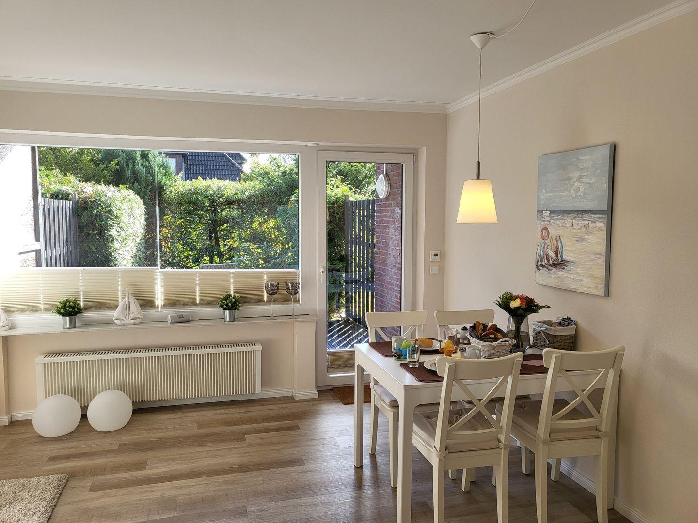 Direkt angeschlossen an das Wohnzimmer befindet sich die eigene Terrasse mit Gartenmöbeln. Von dort aus haben Sie einen schönen Gartenblick und können entspannte Stunden im Freien genießen.