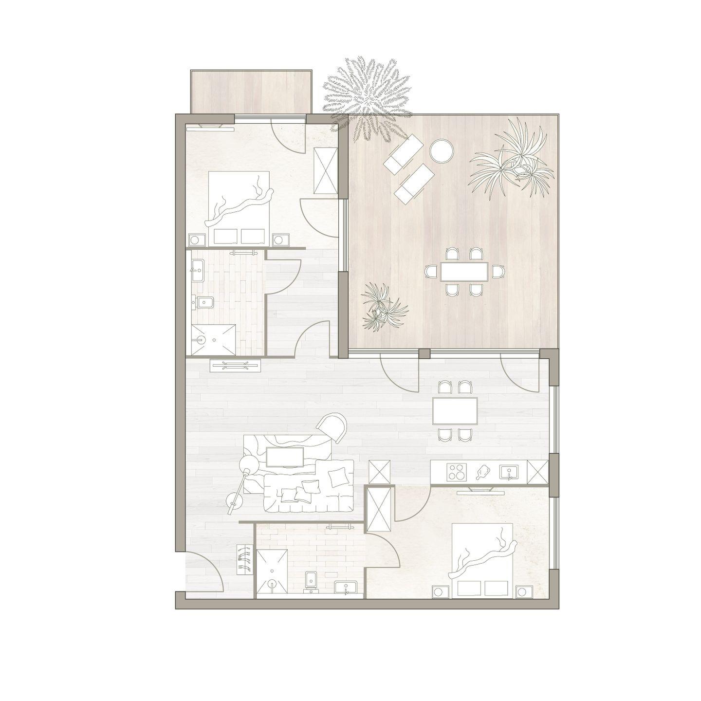 Jeder Schlafraum verfügt über ein eigenes, mit Natursteinfliesen gestaltetes Bad, das Hauptschlafzimmer zudem über einen eigenen Balkon.