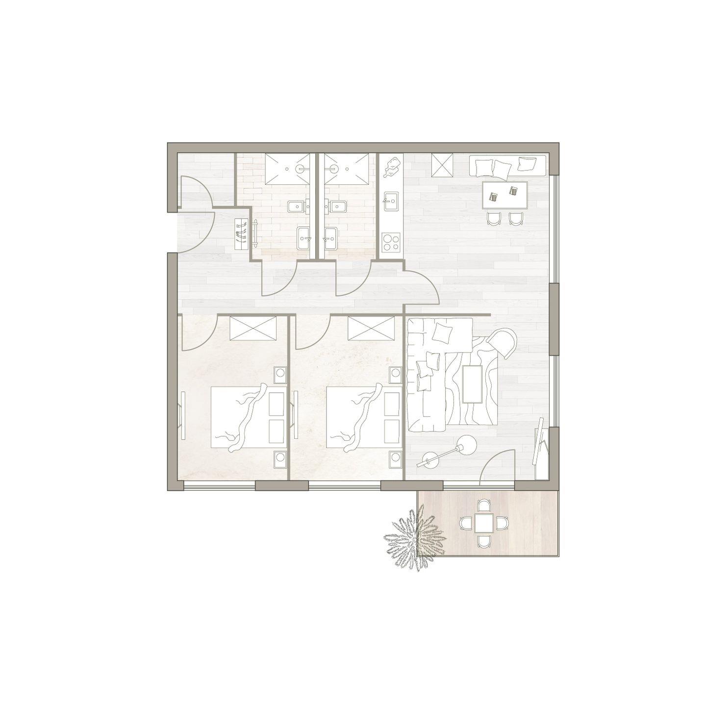 Die möblierte Süd-West-Terrasse bietet fast den ganzen Tag lang Sonne. Die zwei Schlafzimmer sind mit je einem komfortablen Doppelbett, Schrank und Smart TV ausgestattet. Zudem verfügt das Apartment über ein modernes, mit Natursteinfliesen gestaltetes Badezimmer, ein separates WC und einen Abstellraum.