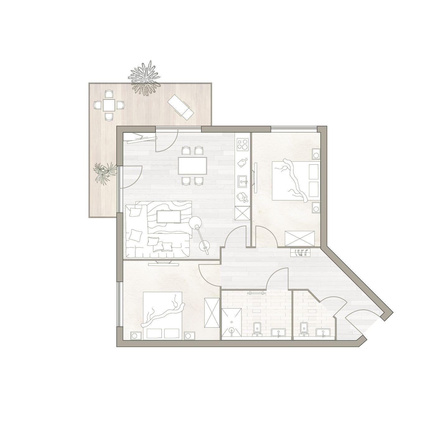 Der offen gestaltete Wohn-Essbereich mit integrierter Küche wird von zwei Seiten mit Tageslicht durchflutet. Der große Esstisch ist ein Ort zum Zusammensein ebenso wie die gemütliche Sofaecke in hellem Naturton. Die möblierte Terrasse in Nord- Ost/Nord-West-Lage bietet Raum für entspannte Momente. Die zwei Schlafzimmer sind mit je einem komfortablen Doppelbett, Schrank und Smart TV ausgestattet. Zudem verfügt das Apartment über ein modernes, mit anthrazitfarbenen Natursteinfliesen gestaltetes Badezimmer und ein separates WC.