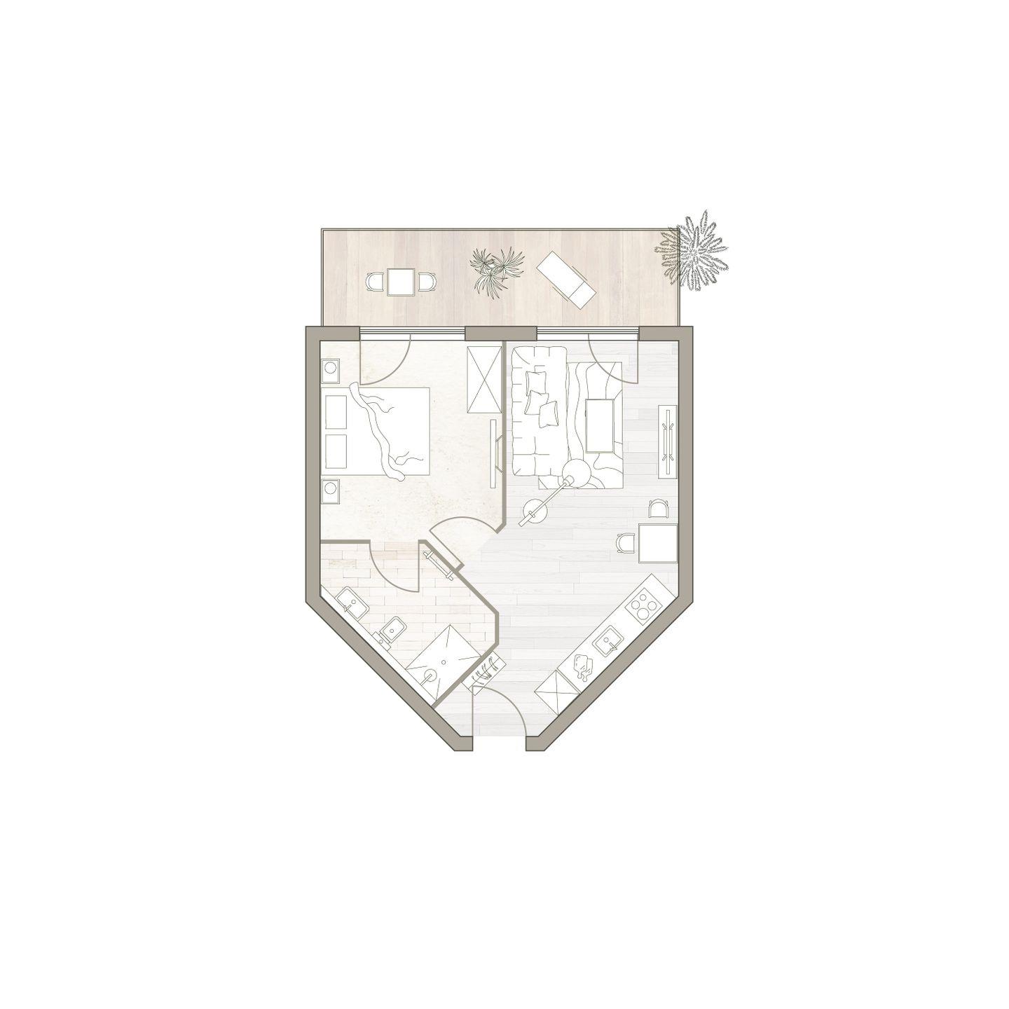 Der offen gestaltete Wohn-Essbereich mit integrierter Küche wird von Nord-Osten mit Tageslicht durchflutet. Ein kleiner Essplatz ist ein Ort zum Zusammensein ebenso wie das gemütliche Sofa in hellem Naturton. Auf der möblierten Terrasse lässt sich der Urlaubstag mit einem Frühstück in der Sonne beginnen. Das separate Schlafzimmer ist mit einem komfortablen Doppelbett, Schrank und Smart TV ausgestattet. Das moderne, mit anthrazitfarbenen Natursteinfliesen gestaltete Badezimmer ist direkt vom Schlafraum aus begehbar.