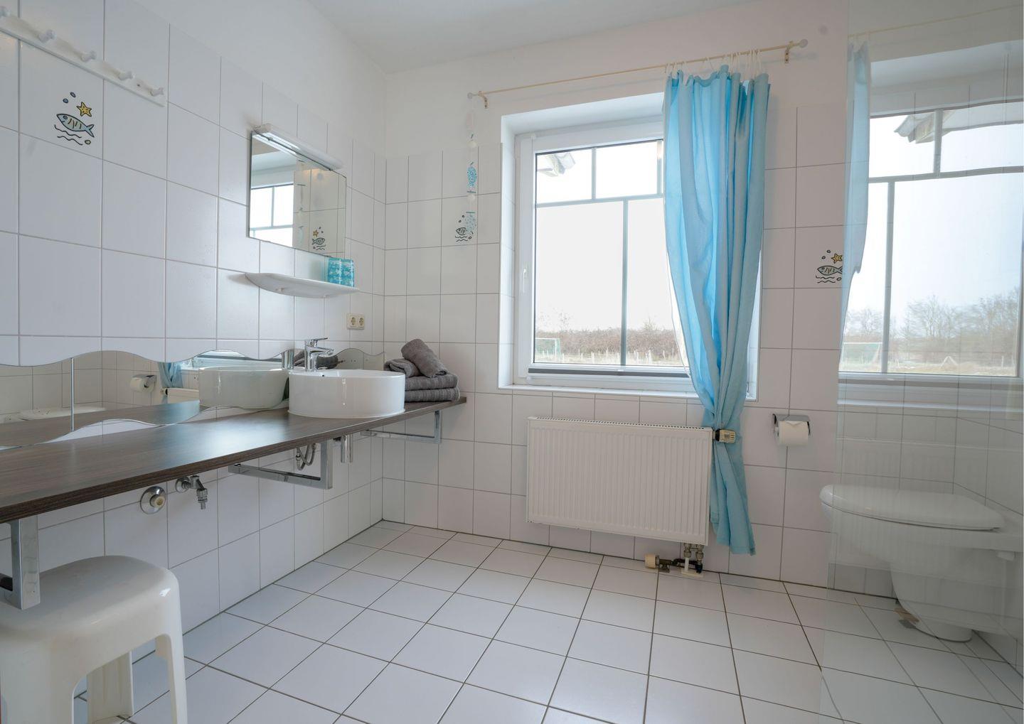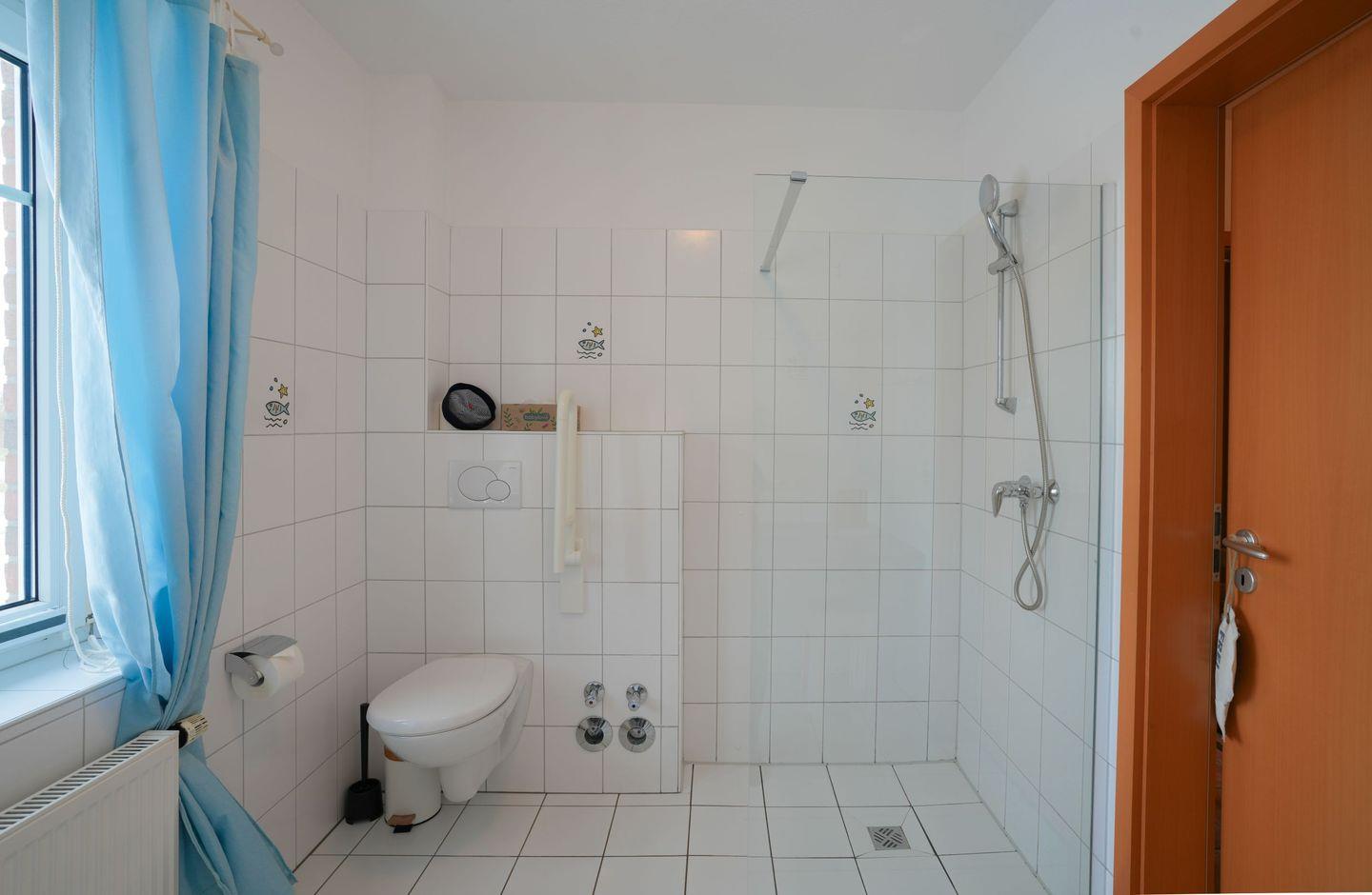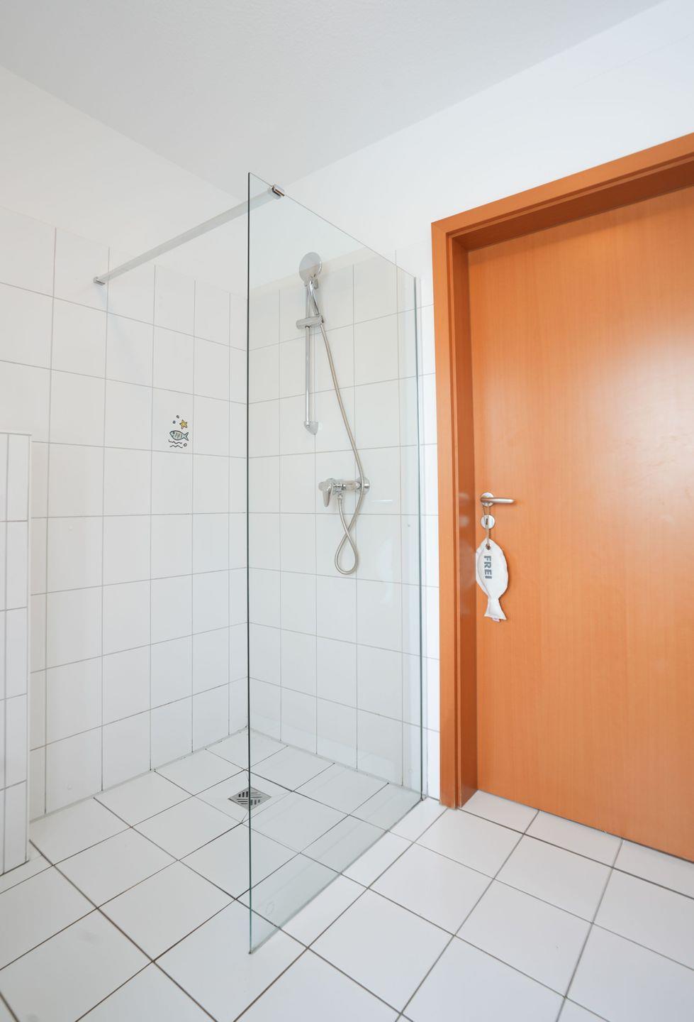 Das Badezimmer verfügt über eine bodengleiche Dusche, WC, Waschbecken, Spiegel und Kosmetikspiegel, warmes Wasser, Fenster sowie einen Haartrockner. Für längere Aufenthalte ist die gemeinschaftliche Nutzung von Waschmaschine und Trockner möglich. Garderobe, Staubsauger sowie Rauch- und Feuermelder runden die Ausstattung ab. Beheizt wird die Unterkunft über eine Gasheizung.