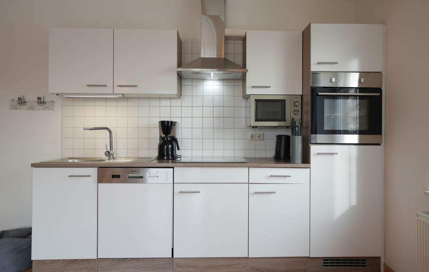 Der Wohnbereich ist mit Fliesenboden ausgestattet und verfügt über Sofaecke, Sofa, Sessel, TV sowie WLAN/Internet. Ein Essbereich mit Esstisch ergänzt den Raum. Die offene Küche ist zum Wohnzimmer hin gestaltet und bietet eine solide Ausstattung für die Selbstversorgung: Ceran-Herd, Backofen (elektrisch), Mikrowelle, Kühlschrank mit Gefrierfach, Spülmaschine, Wasserkocher, Toaster, Kaffeemaschine, Mixer sowie Küchenutensilien, Geschirr und Besteck. Eine Erstausstattung und Geschirrhandtücher stehen ebenfalls bereit.