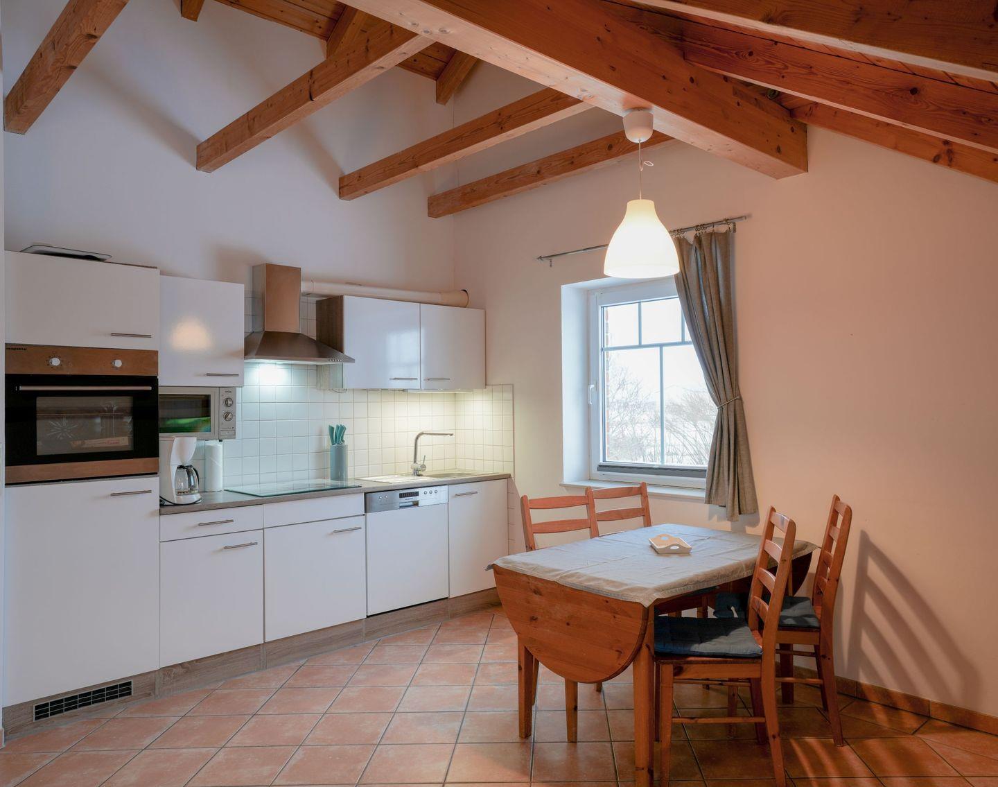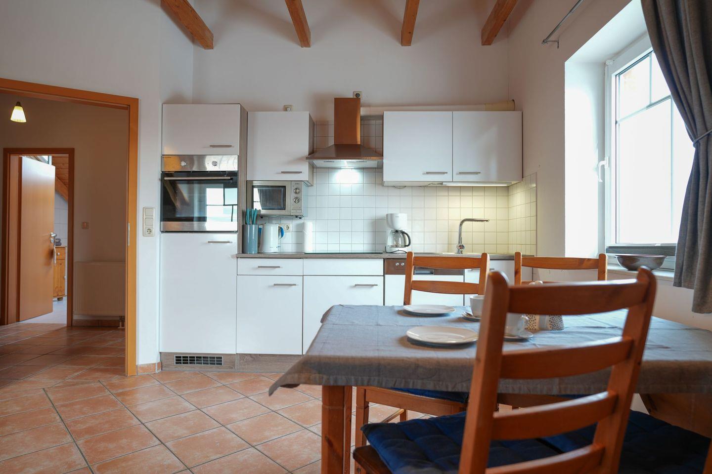 Die offene Küche ist direkt zum Wohnzimmer hin gestaltet und voll ausgestattet für die Selbstversorgung. Ihnen stehen unter anderem Backofen (elektrischer Anschluss), Mikrowelle, Spülmaschine, Kühlschrank mit Gefrierfach, Kaffeemaschine, Wasserkocher, Toaster und Mixer zur Verfügung. Geschirr, Besteck, Küchenutensilien sowie Geschirrtücher und ein Abfalleimer sind vorhanden.