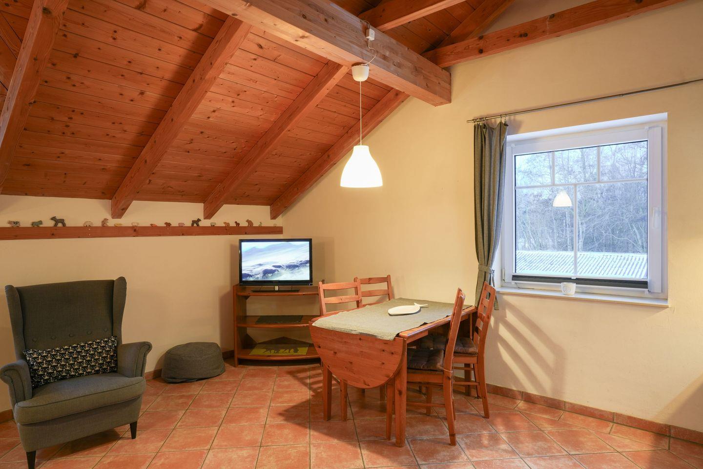 Der Wohnbereich ist als offener, freundlicher Mittelpunkt gestaltet: Wohnzimmer mit Sofaecke, Sofa, TV sowie Internet und WLAN gehen nahtlos in den Essbereich mit Esstisch über. Der Bodenbelag in Wohn- und Schlafzimmern ist Vinyl, was den Alltag angenehm unkompliziert macht. Für behagliche Temperaturen sorgt eine Gasheizung.