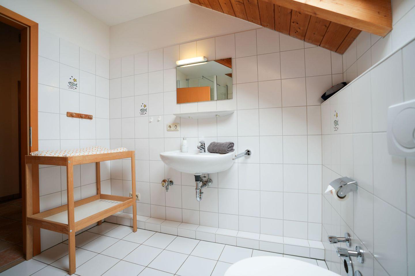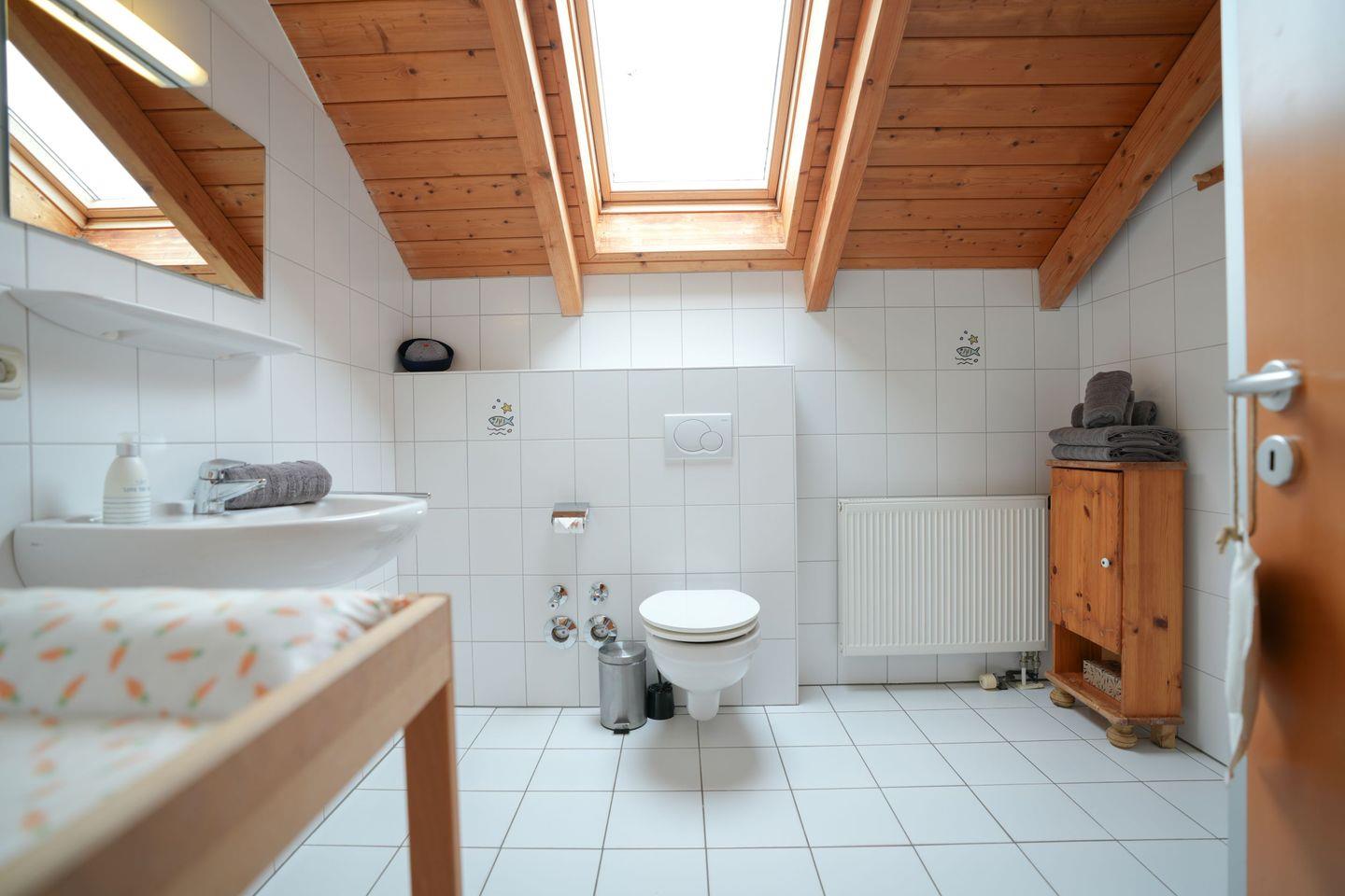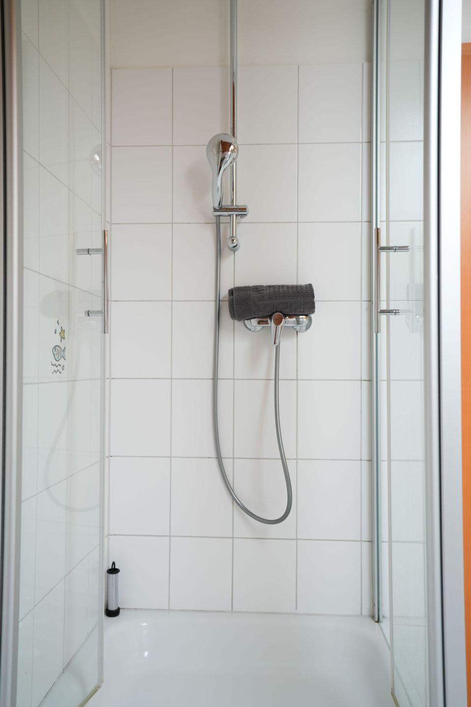 Das Badezimmer verfügt über Tageslicht (Fenster) und ist mit WC, Waschbecken, Spiegel, Kosmetikspiegel und Haartrockner eingerichtet. Die Dusche befindet sich in einer Badewanne; warmes Wasser ist selbstverständlich verfügbar.