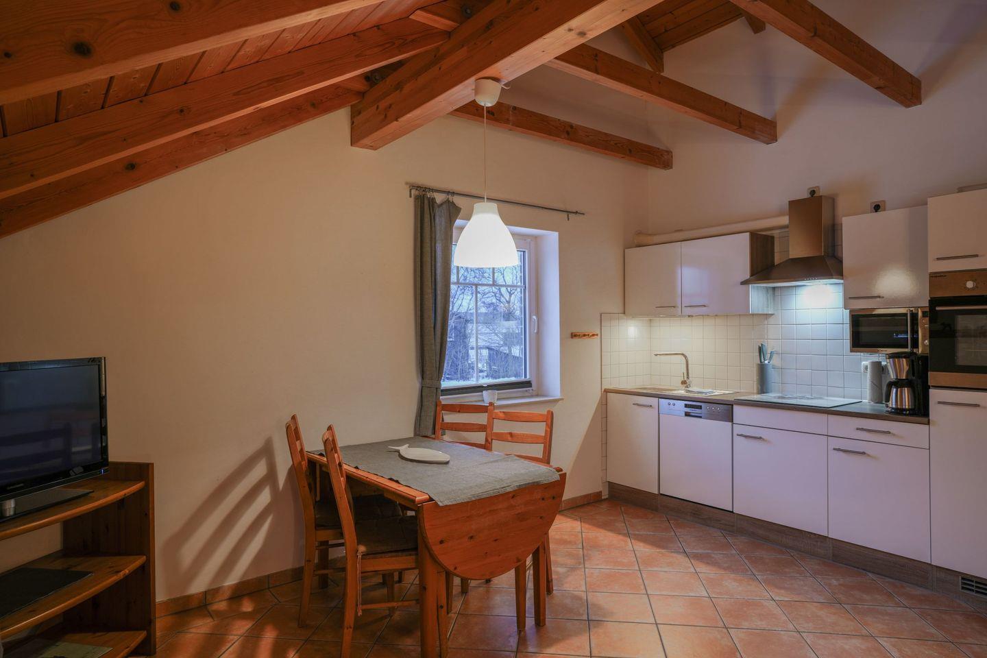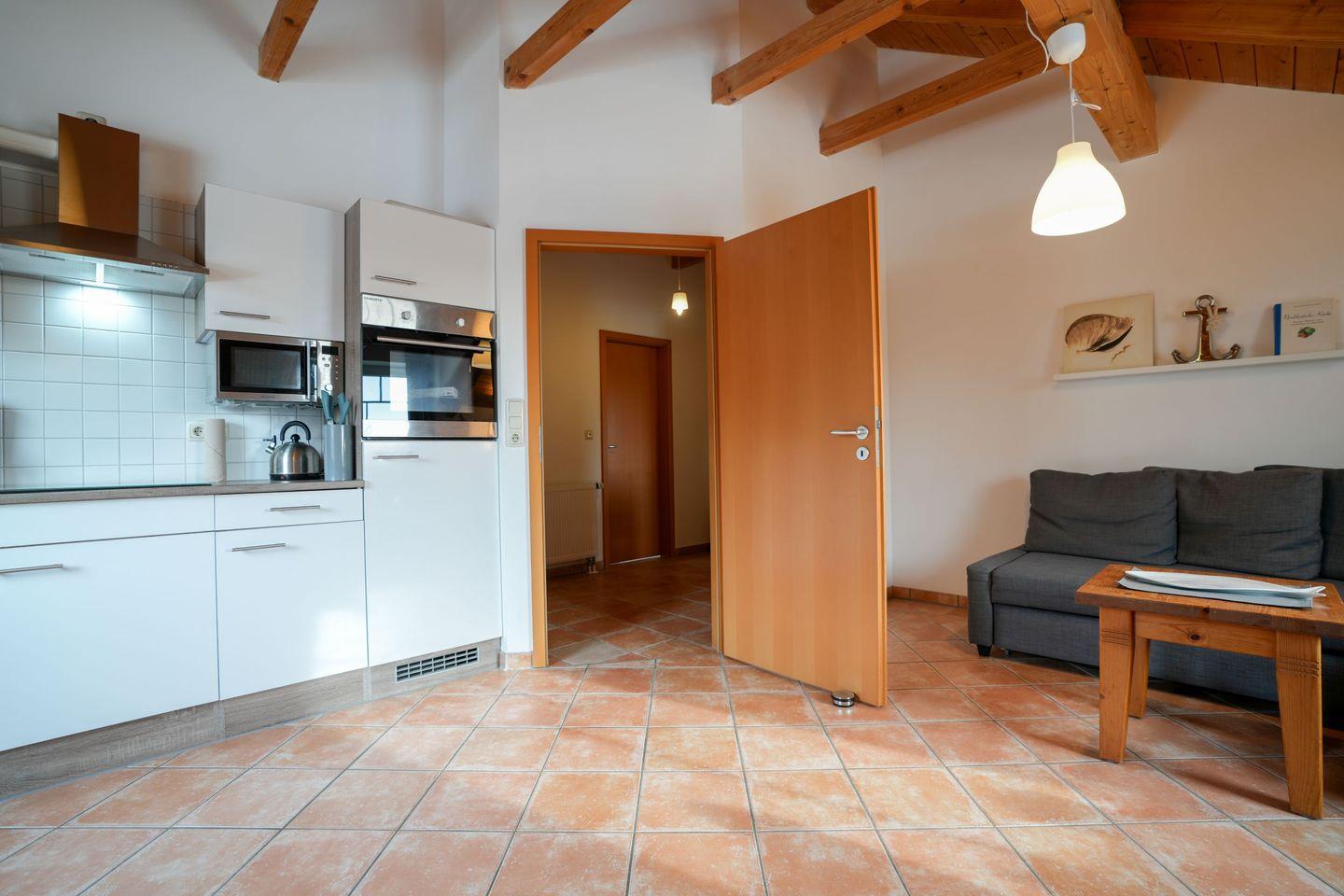Die offene Küche zum Wohnzimmer ist umfassend ausgestattet und unterstützt eine flexible Selbstversorgung: Ceran-Herd, Backofen (elektrisch), Mikrowelle, Kühlschrank mit Gefrierfach, Spülmaschine sowie Kaffeemaschine, Wasserkocher, Toaster und Mixer sind vorhanden. Küchenutensilien, Geschirr und Besteck, Geschirrhandtücher und ein Abfalleimer ergänzen die Ausstattung.