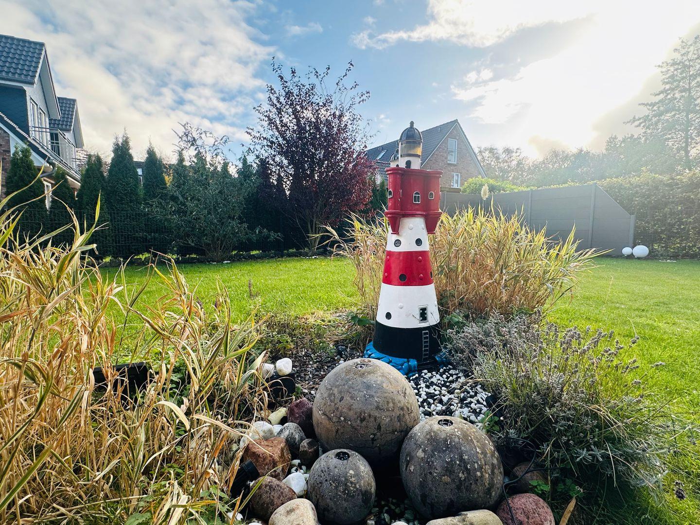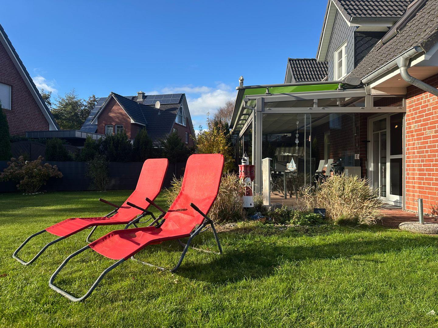 Der eingezäunte Garten bietet zusätzlich viel Platz zum Entspannen und Spielen.