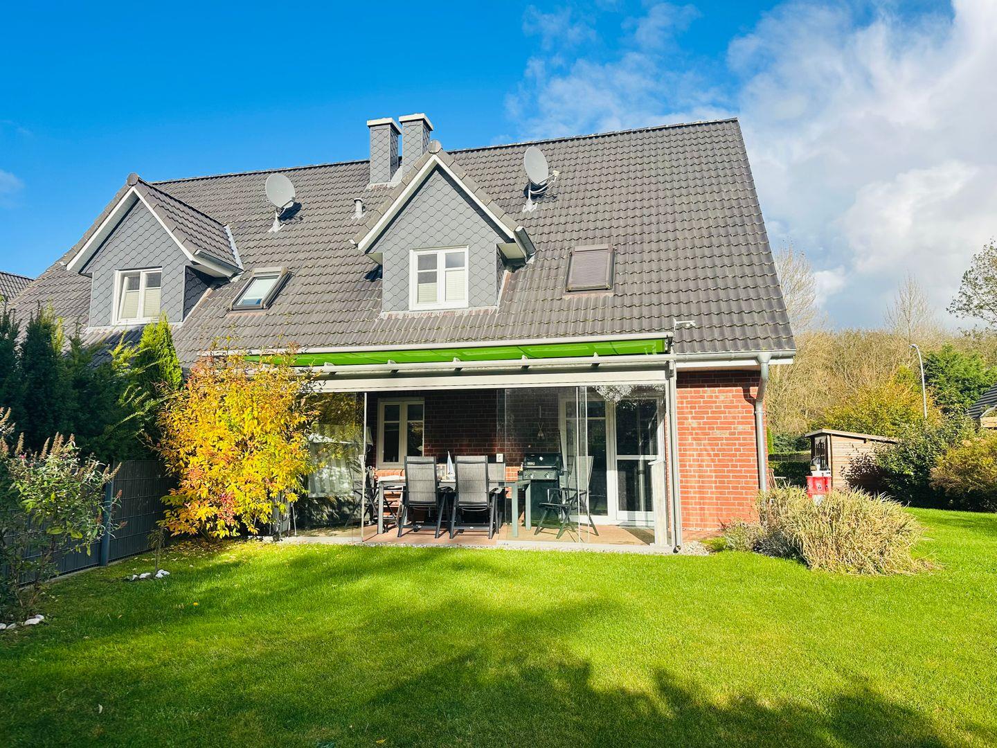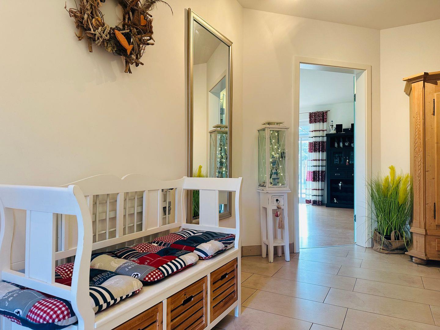Ein besonderes Highlight ist der lichtdurchflutete Wintergarten mit Südwest-Ausrichtung. Hier genießen Sie auf dem großzügigen Sitzbereich oder im Strandkorb die Sonne – perfekt, um den Tag bei einer Tasse Kaffee oder einem Glas Wein ausklingen zu lassen.