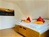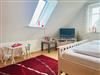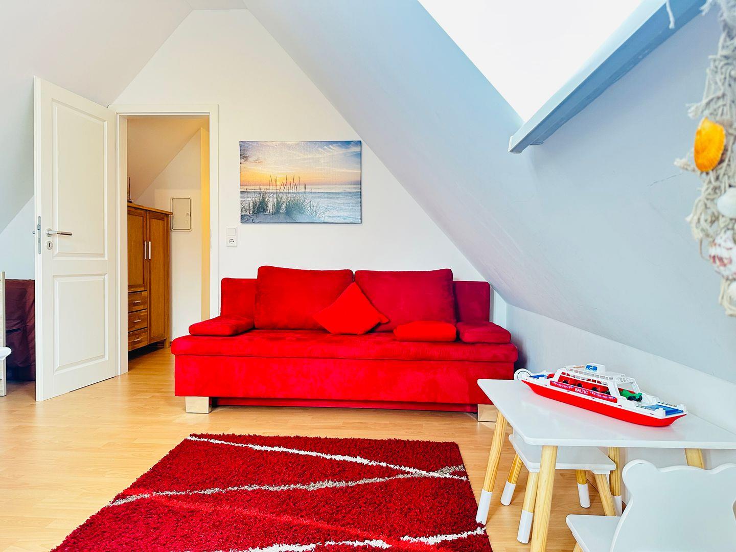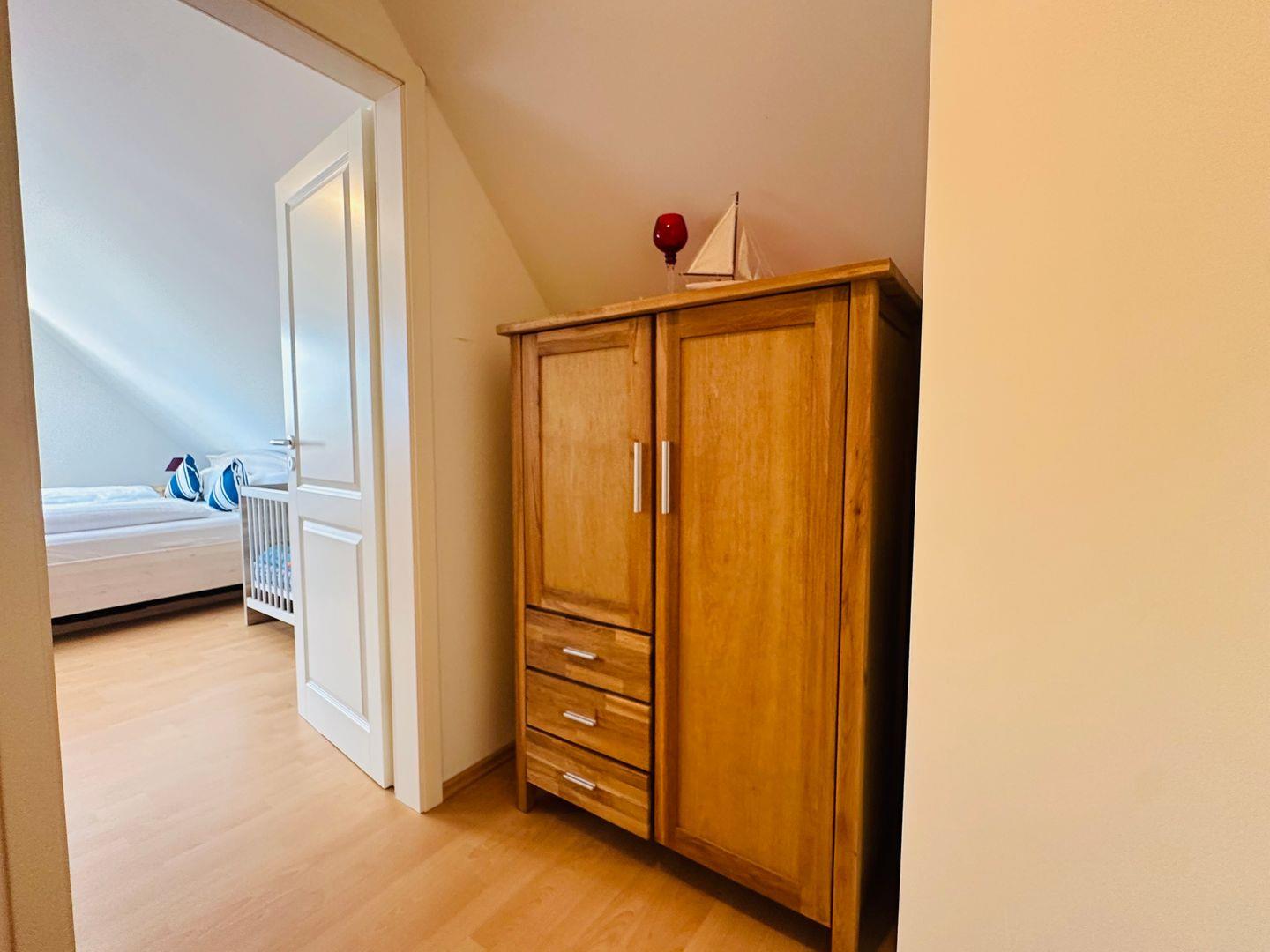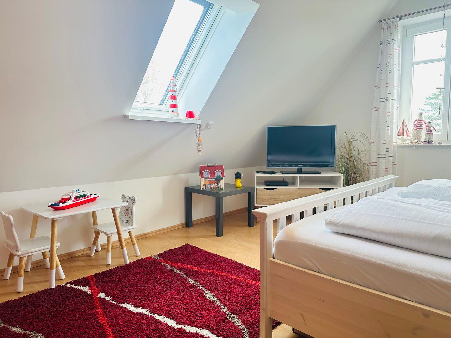 Im Dachgeschoss erwartet Sie ein weiteres Schlafzimmer mit Fernseher, Babybett und einem kleinen Spielbereich für Kinder.