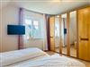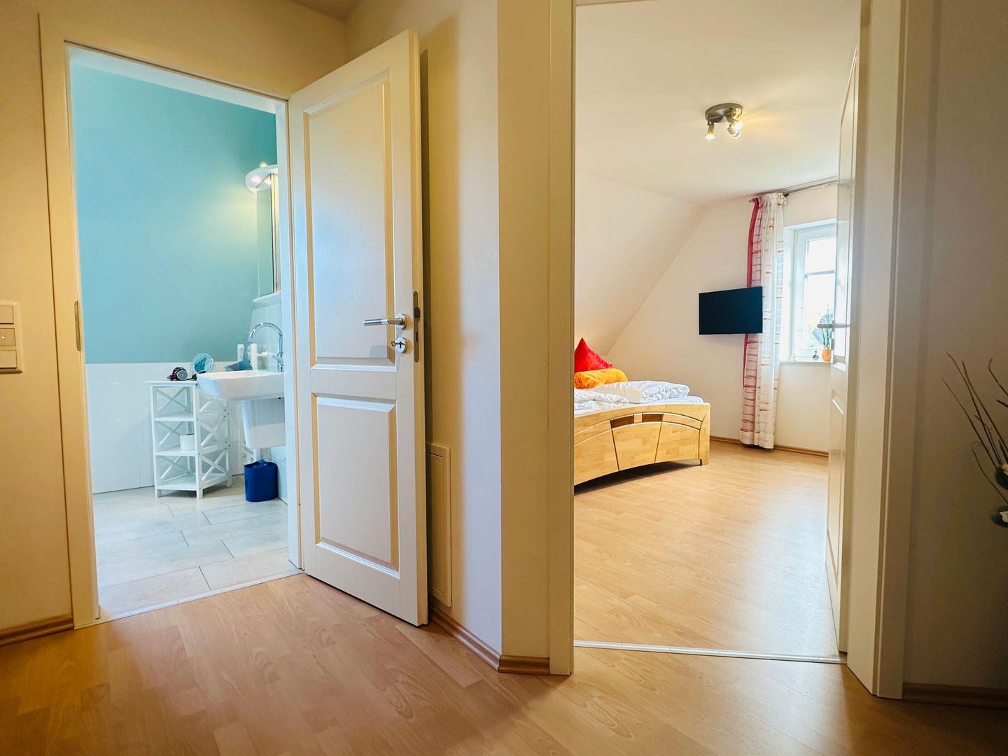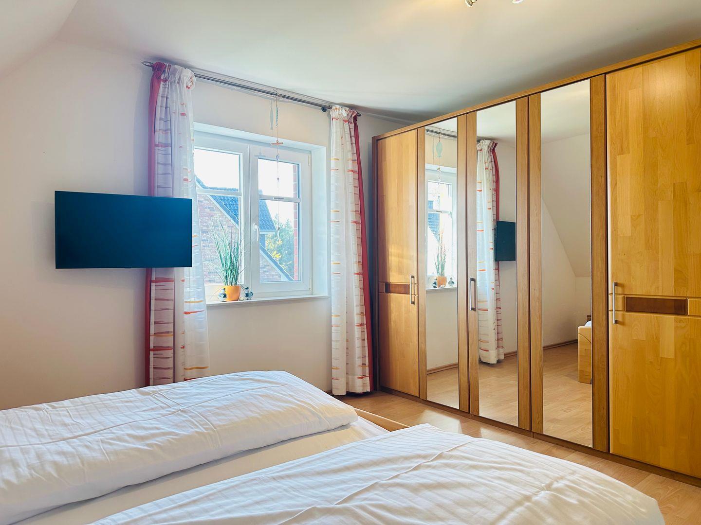Im Obergeschoss befindet sich ein Schlafzimmer mit Fernseher und Kleiderschrank.