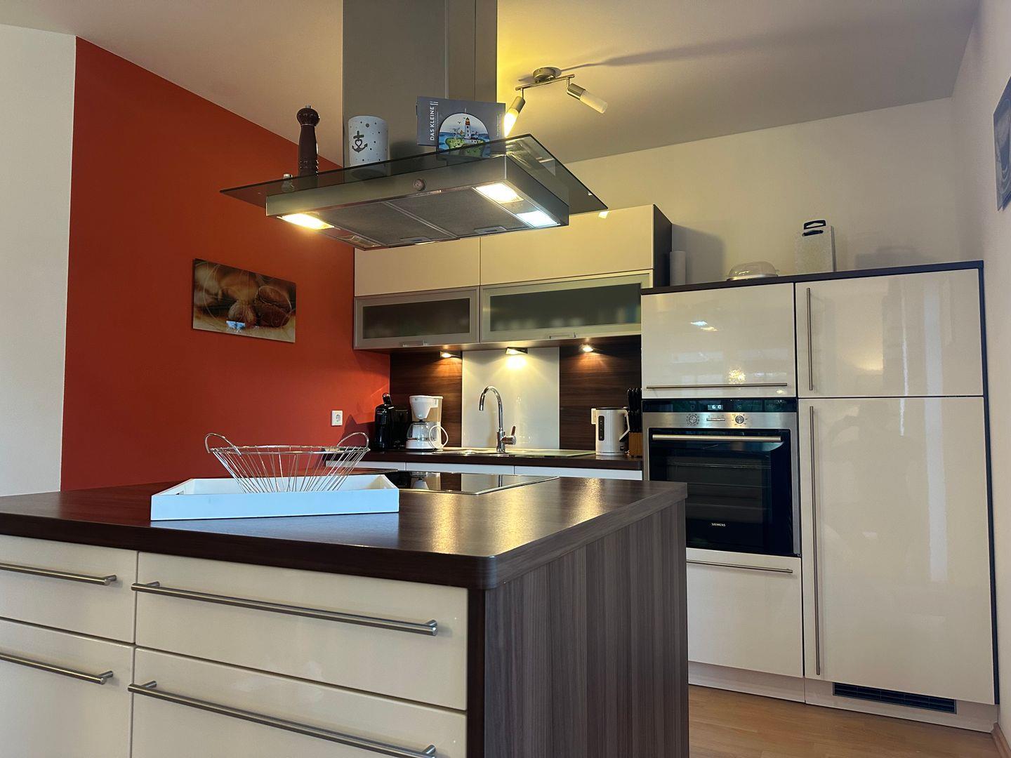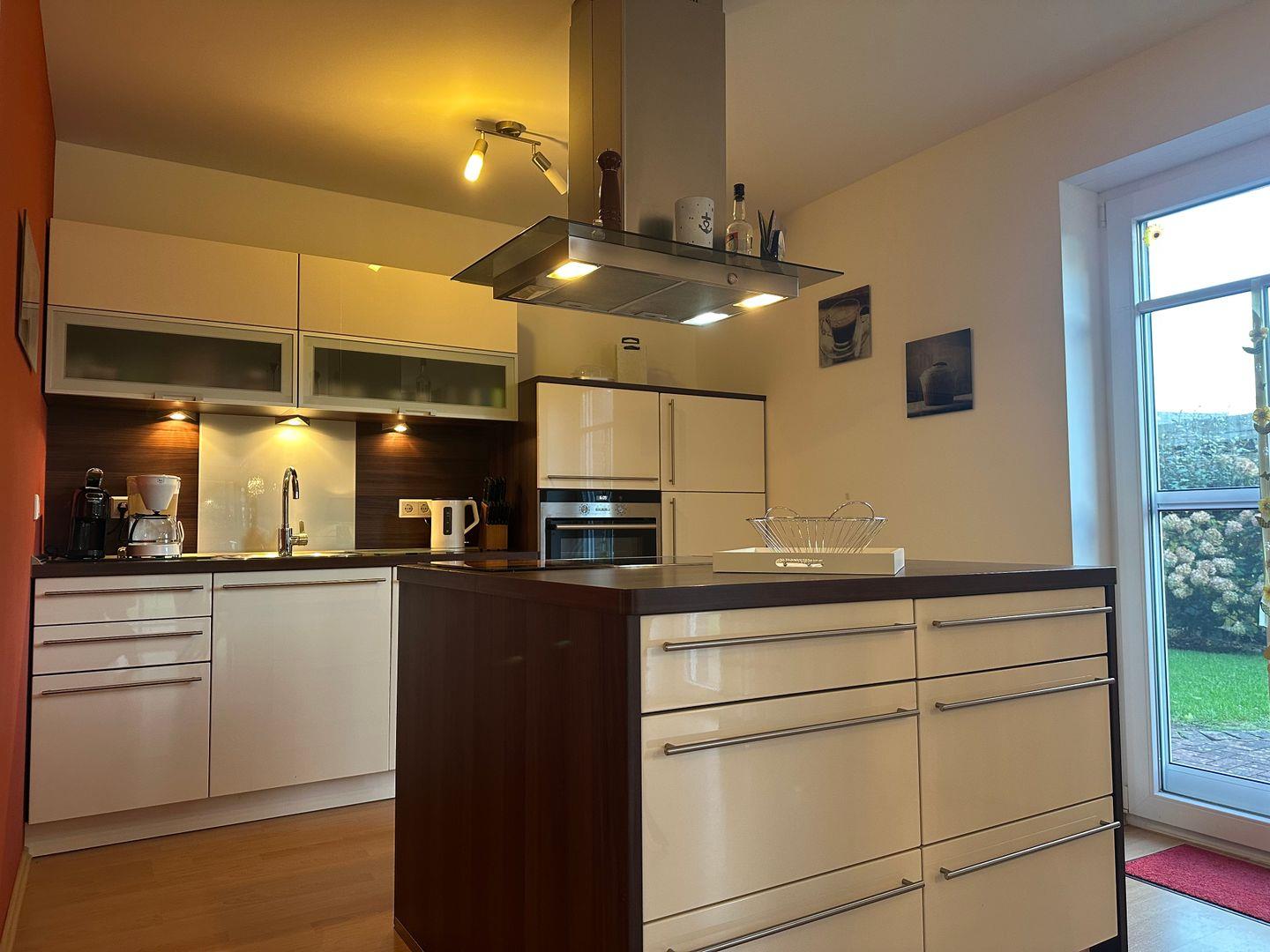 Im offenen Wohn- und Essbereich erwartet Sie eine moderne Küche mit Kochinsel, ausgestattet mit Nespresso- und Filterkaffeemaschine, Toaster, Backofen sowie einem Kühlschrank mit Gefrierfach – ideal für gemeinsame Kochmomente. Der angrenzende Wohnbereich lädt mit einem großen Sofa, Kamin und Fernseher zu entspannten Abenden ein.
