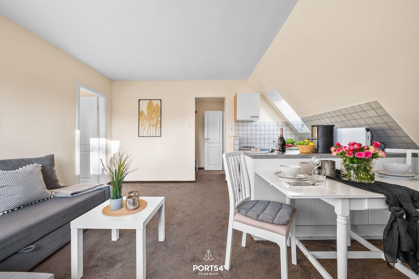 Der offene Wohn- und Essbereich verbindet Komfort mit Funktionalität: Am Esstisch könnt ihr gemeinsame Mahlzeiten genießen – sei es nach einem Tag am nahen Sandstrand oder nach ausgedehnten Spaziergängen in der Umgebung.