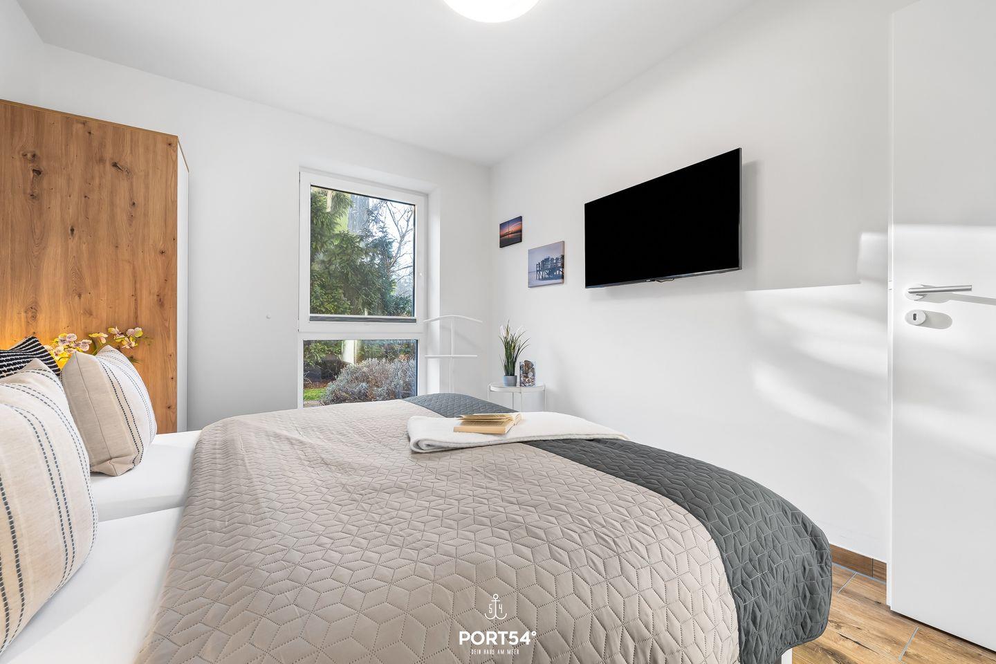 Im offenen Wohn- und Essbereich findest du eine komfortable Sofaecke, einen separaten Essplatz und zahlreiche Fenster, die viel Tageslicht hereinlassen und den Blick ins Grüne ermöglichen. Der elektrische Kamin verleiht dem Raum noch mehr Gemütlichkeit. Vier digitale Fernseher stehen dir ebenso zur Verfügung wie eine schnelle Internetverbindung, sodass auch das Arbeiten aus dem Ferienhaus problemlos möglich ist. Zur Entspannung im Freien laden die sonnige Terrasse mit Gartenblick, Sonnenliegen, zwei Strandkörbe sowie eine Liegewiese ein – ideale Voraussetzungen, um die maritime Atmosphäre in aller Ruhe zu genießen. Grillfreunde können den eigenen Gasgrill und das Gartenhaus nutzen, während die Gartenmöbel zu geselligen Mahlzeiten im Freien einladen.