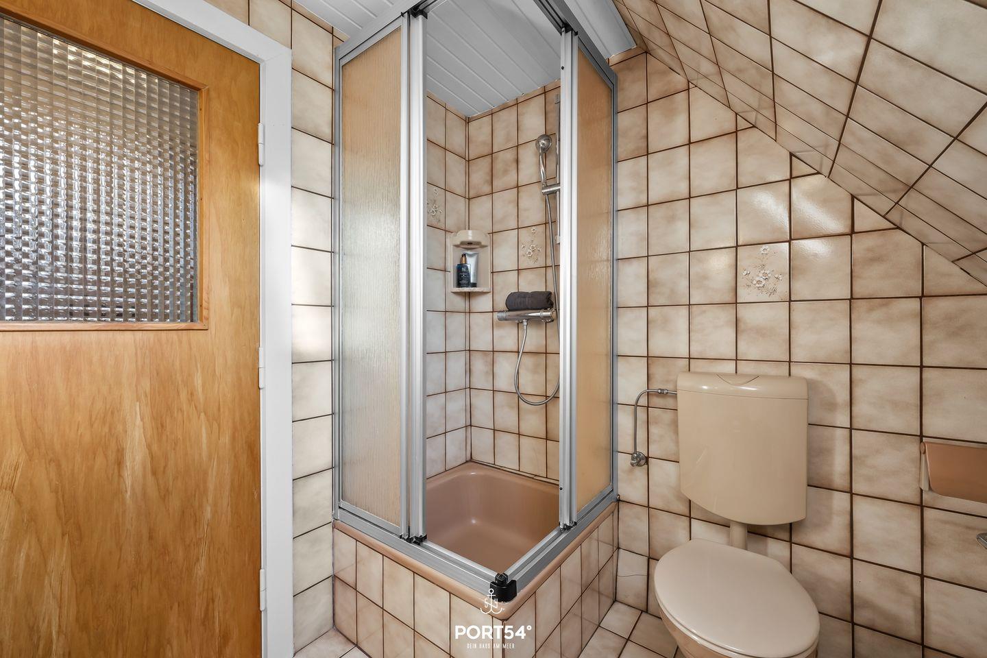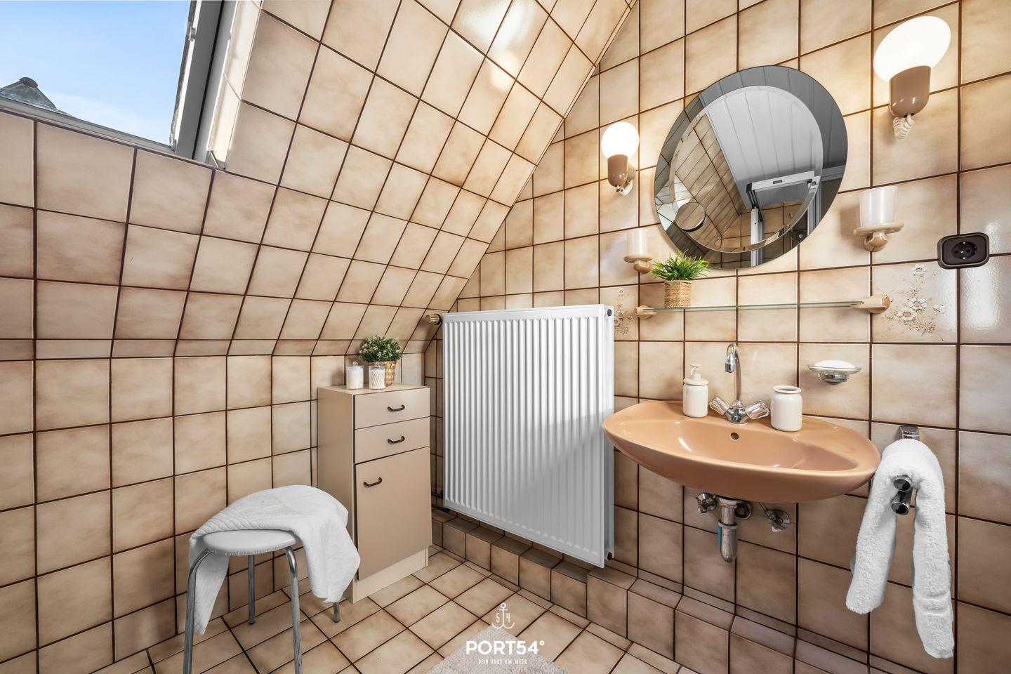 Das Badezimmer ist mit einer Dusche inklusive Wanne, WC, Fenster, Waschbecken, Spiegel sowie einem Haartrockner gut ausgestattet. Ein Rauchmelder sorgt für zusätzliche Sicherheit.