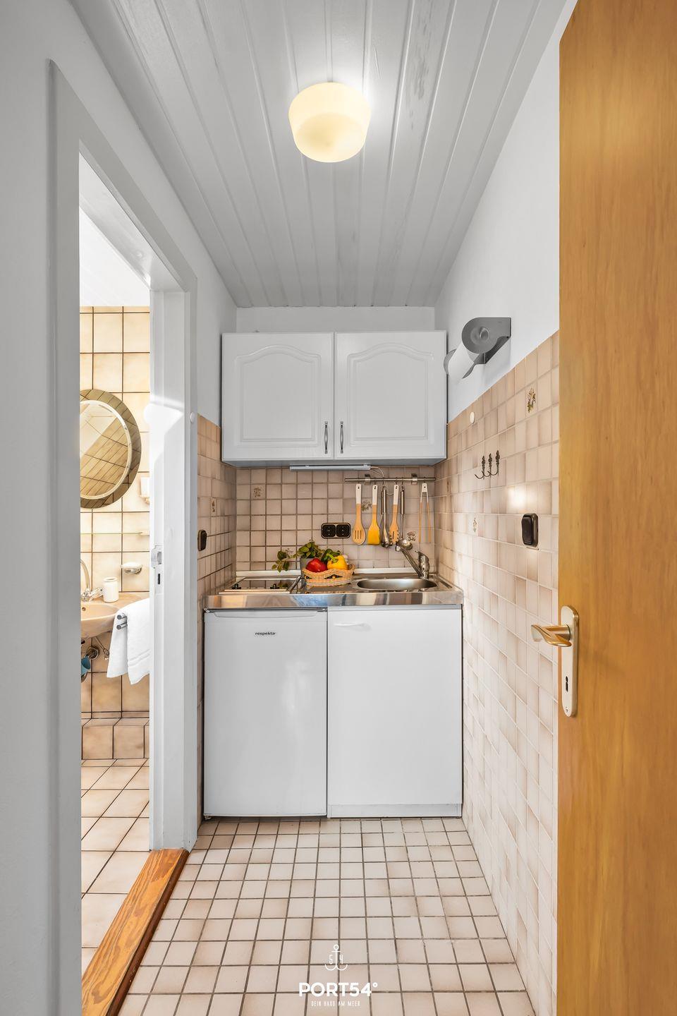 Die kleine Kochnische bietet dir alles Notwendige zur Selbstversorgung: eine Kaffeemaschine, einen Toaster, einen Wasserkocher, einen Kühlschrank mit integriertem Gefrierfach, einen 2-Platten-Herd sowie ausreichend Geschirr und Besteck. Ein Esstisch lädt dich zu gemeinsamen Mahlzeiten ein. Für längere Aufenthalte stehen dir ein Wäscheständer und ein Staubsauger bereit. Die Wohnung ist auch ideal für deine Workation geeignet. Direkt nebenan befindet sich eine weitere Wohnung mit zwei Schlafzimmern und drei Schlafplätzen.