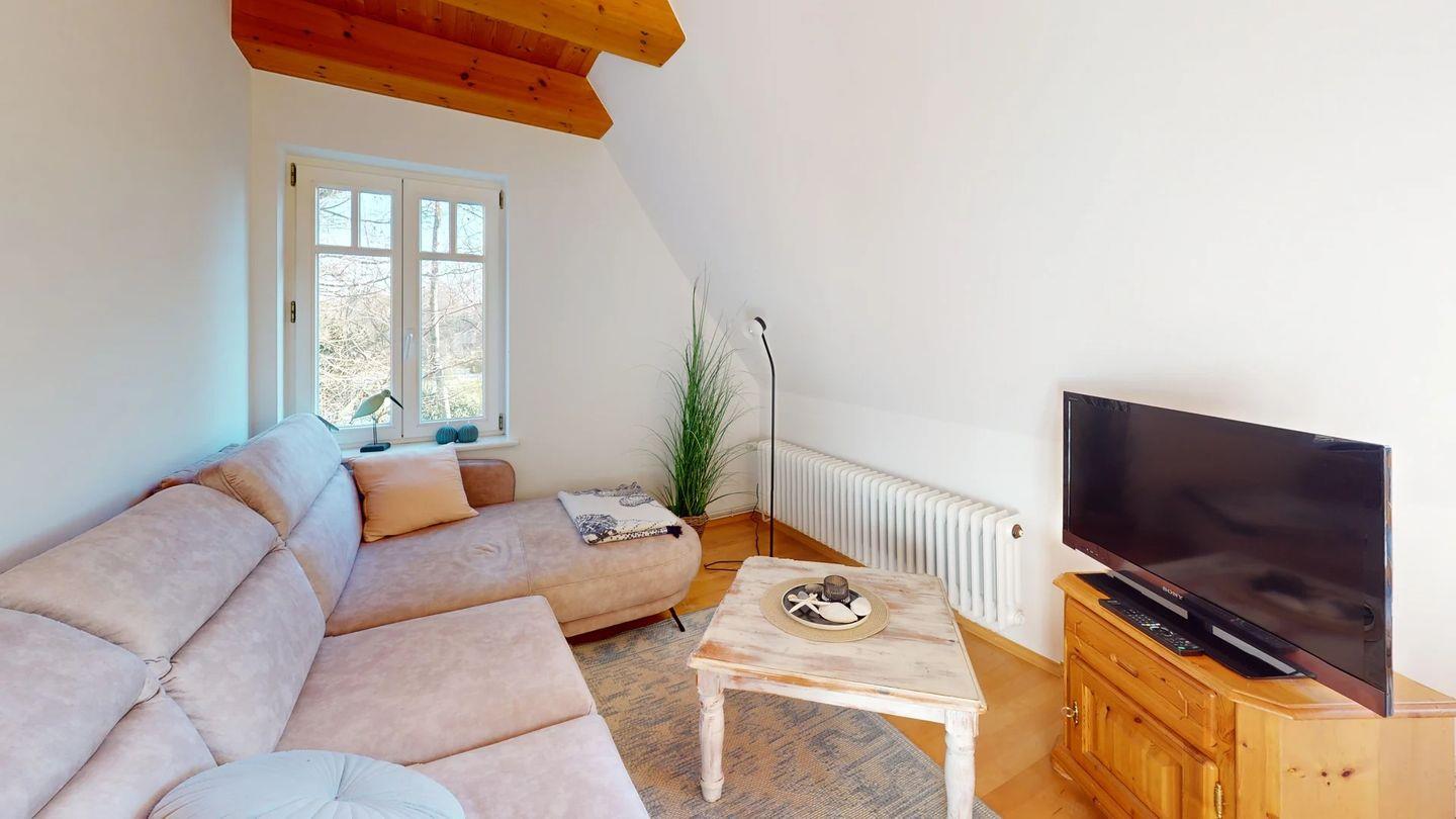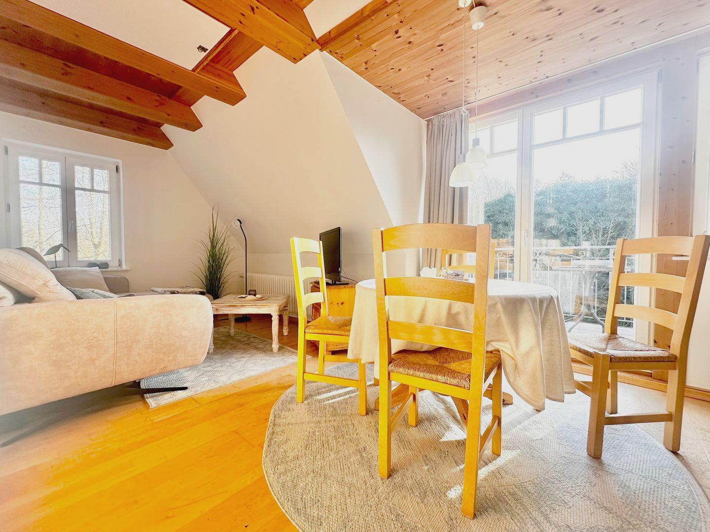 Die Wohnung verfügt über ein Schlafzimmer mit zwei Einzelbetten, die bei Bedarf zu einem Doppelbett zusammengeschoben werden können. Der offene Wohn- und Essbereich ist hell und freundlich gestaltet und integriert die gut ausgestattete Küche mit Kapselmaschine, Mikrowelle und Spülmaschine.