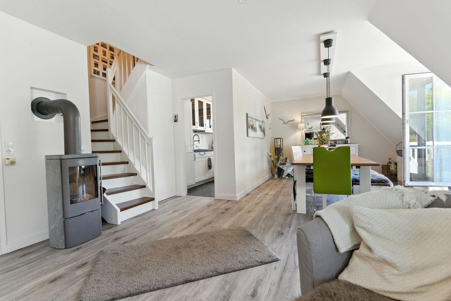 Im Wohnbereich erwartet Sie eine komfortable Sofaecke mit Sofa und Sessel sowie ein TV für gemeinsame Abende. Für eine behagliche Atmosphäre sorgt ein Kaminofen. Ein Essbereich mit Esstisch ist ebenfalls vorhanden – ideal für gemeinsame Mahlzeiten oder Spieleabende. Fliegengitter und Sichtschutz an allen Fenstern tragen zu einem ungestörten Aufenthalt bei.