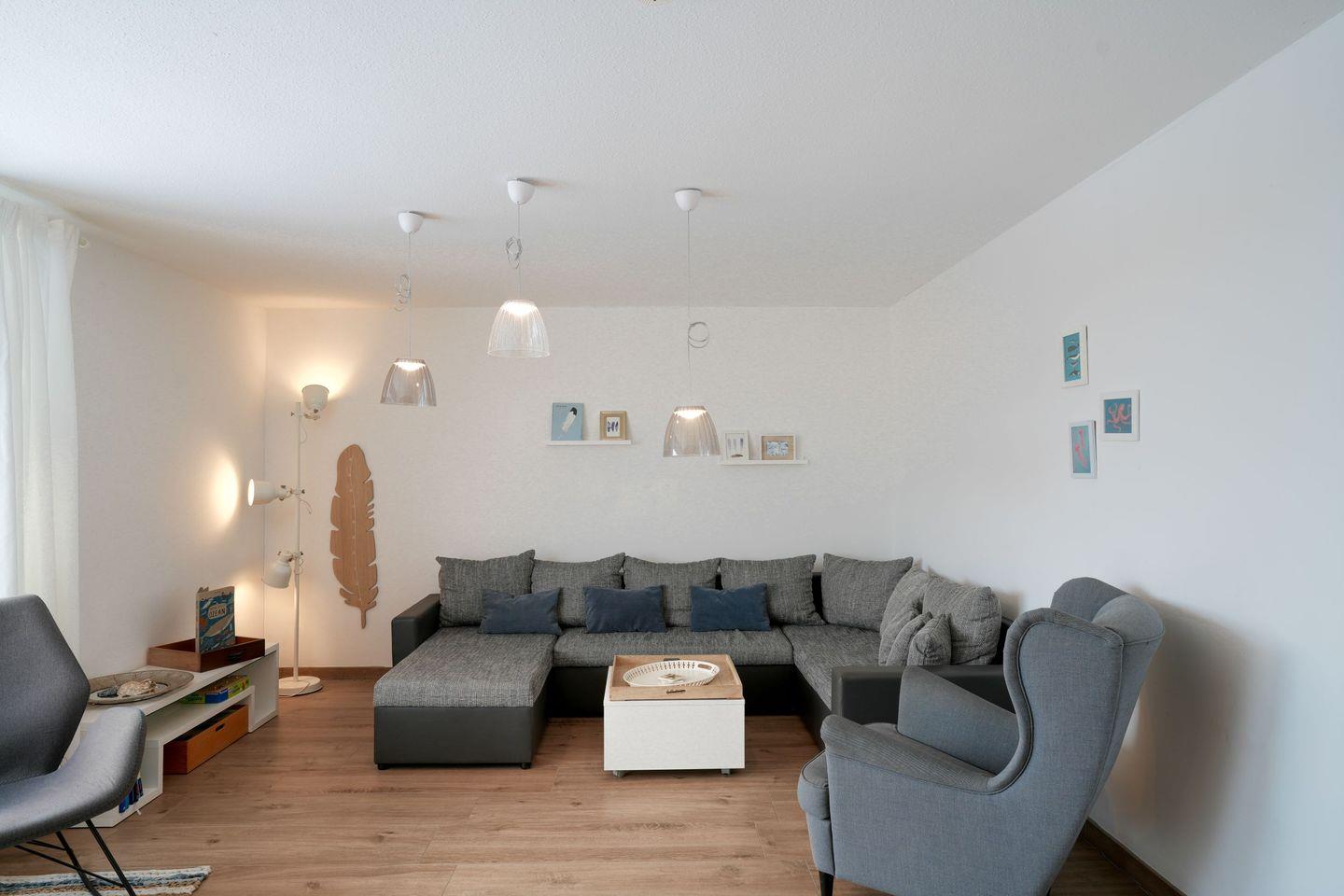 Im Erdgeschoss befinden sich der Eingangsbereich, die voll ausgestattete Küche sowie der großzügige Essbereich, unser ganz persönlicher Lieblingsplatz. Hier kommen alle zusammen – zum Kochen, Essen und Zusammensitzen. Ebenfalls im Erdgeschoss liegen zwei Schlafzimmer, eines kleiner und eines größer, sowie ein Badezimmer mit ebenerdiger Dusche.