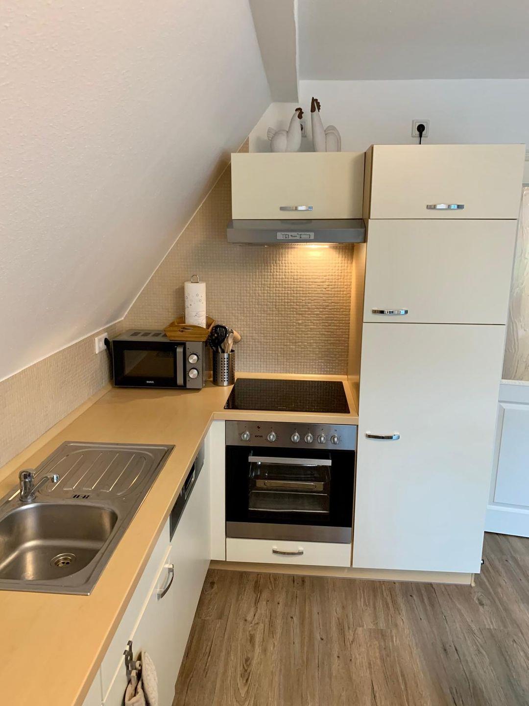 Einbauküche mir Cerankochfeld, Mikrowelle, Backofen, Toaster, Kaffeemaschine, Nespresso- Kapselmaschine, Eierkocher, Geschirr- und Spültücher, Geschirrspüler, Kühl- Gefrierkombination, Waschmaschine und Trockner (Spültabs und Waschmittel inkl.), SAT-LCD Fernseher in allen Wohn- und Schlafzimmern, kostenloser Internetzugang, ausreichend Geschirr, Gläser, Besteck und Kochutensilien. Insektenschutz.
