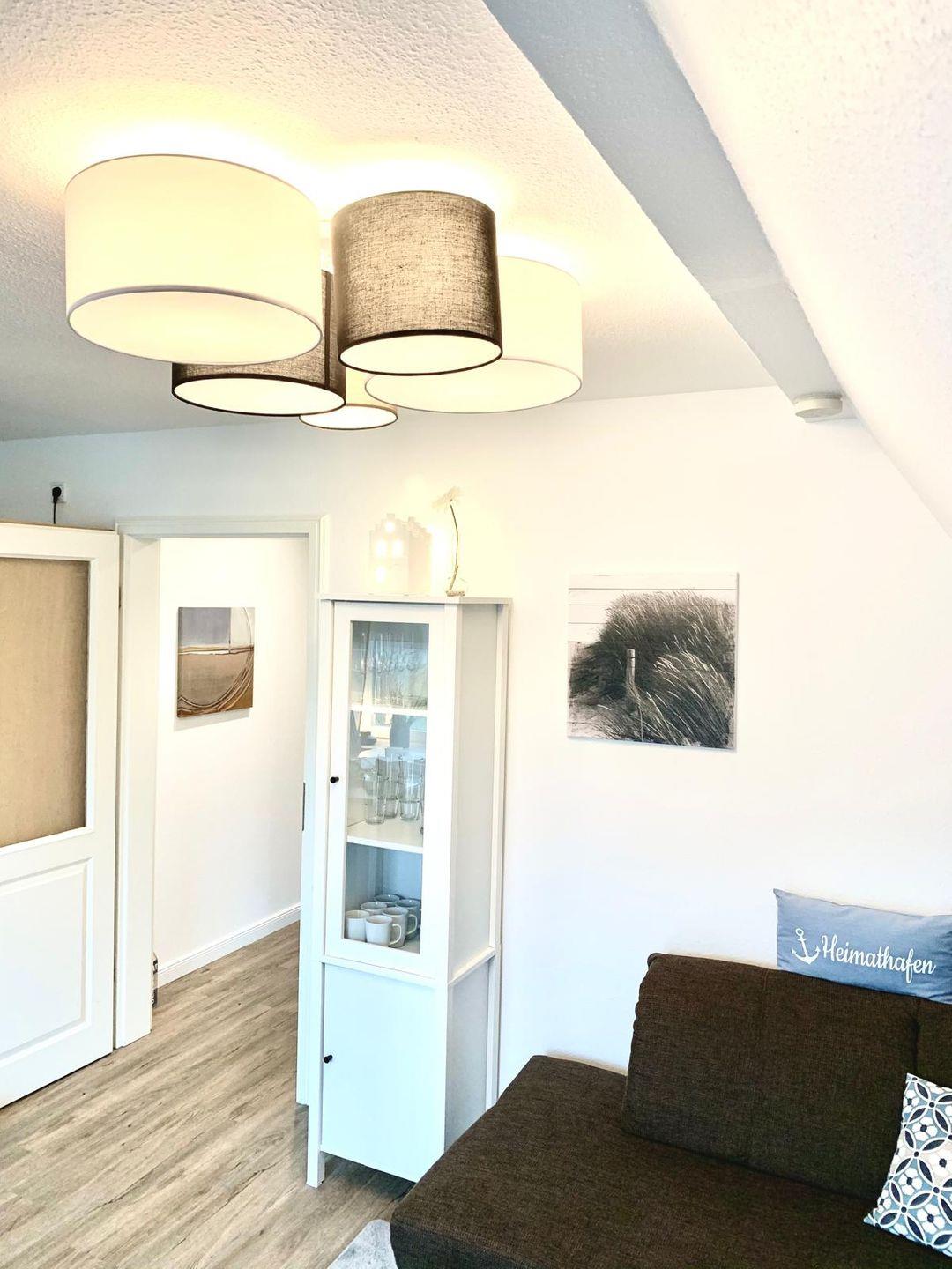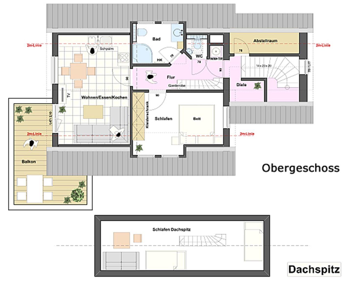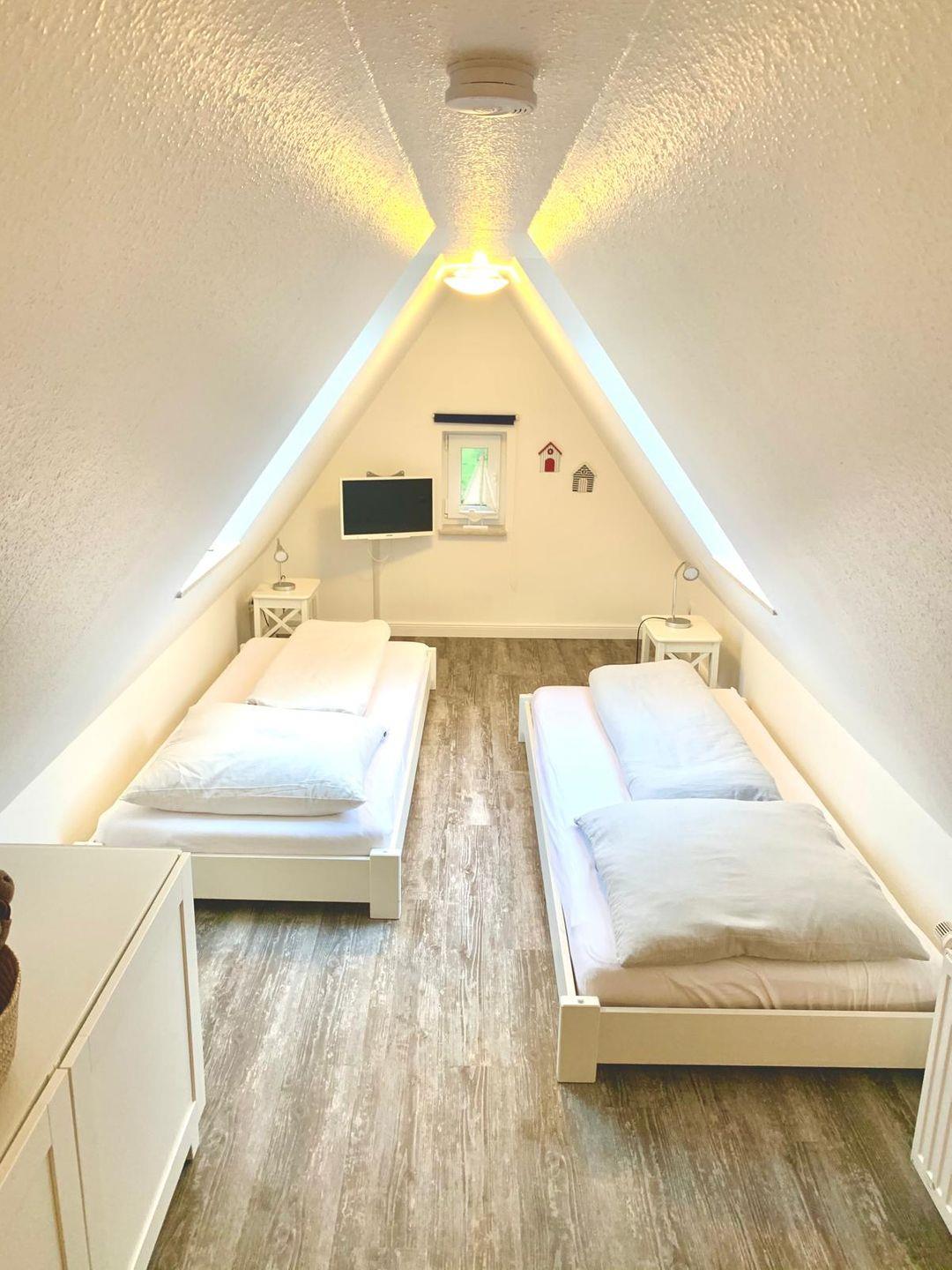 Obergeschoß, ca 50 qm Wohnfläche sowie ein Spitzboden, aufgeteilt in drei Zimmer (incl. Spitzboden) Wohn-Esszimmer mit offener Küche. Ausgang auf einen großen Ost-Süd-Westbalkon, ausgestattet mit Gartenmöbeln, Sonnenschirm sowie Strandkorb. Schlafzimmer mit einem großen Boxspringbett, im Spitzboden zwei Betten & Sitzgelegenheit, Duschbad/WC, separates WC, Abstellraum.