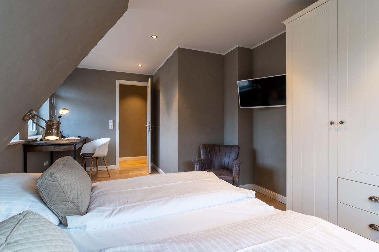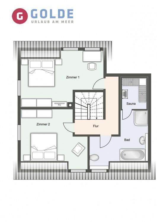 Über eine Holztreppe gelangt man in das mit Parkett ausgelegte Obergeschoss. Dieses verfügt ebenfalls über eine Fußbodenheizung. Die beiden Schlafzimmer, eines mit einem Boxspring-Doppelbett und eines mit 2 Boxspring-Einzelbetten, sind ebenfalls jeweils mit TV ausgestattet. Ein hochwertiges Schranksystem gewährt Ihnen hinreichend Ablageflächen. Darüber hinaus befindet sich im Obergeschoss ein weiteres, geräumiges Bad das mit Dornbracht Armaturen, Regendusche, Badewanne und einer großzügigen Sauna ausgestattet ist. Vom Obergeschoss führt die Holztreppe hinauf in das Dachgeschoss. Hier befindet sich ein zusätzliches Schlafzimmer mit 2 Boxspring-Einzelbetten. Dieses wunderschön eingerichtete Haus lässt keine Wünsche offen und bringt Sie sofort in Urlaubsstimmung. Zu dem Ferienhaus gehört ein Parkplatz für ein Auto. Das Grundstück verfügt über eine große Rasenfläche und ist mit einer geschützten, sonnigen Terrasse mit einheimischen Pflanzen und einer Düne angelegt. Aus einem Strandkorb können Sie den Blick auf das Haus oder die Düne genießen. Carpe Diem!