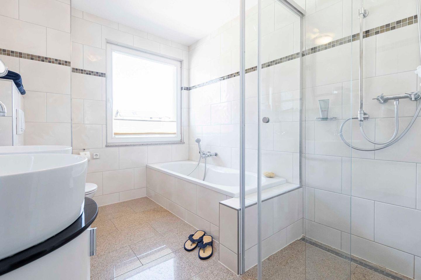 Unsere Gäste haben Zugang zur gesamten Ferienwohnung inklusive Wohnzimmer, zwei Schlafzimmern mit Balkon und Meerblick, dem großzügigen Badezimmer mit Dusche und Badewanne sowie einem separaten WC im Saunabereich.