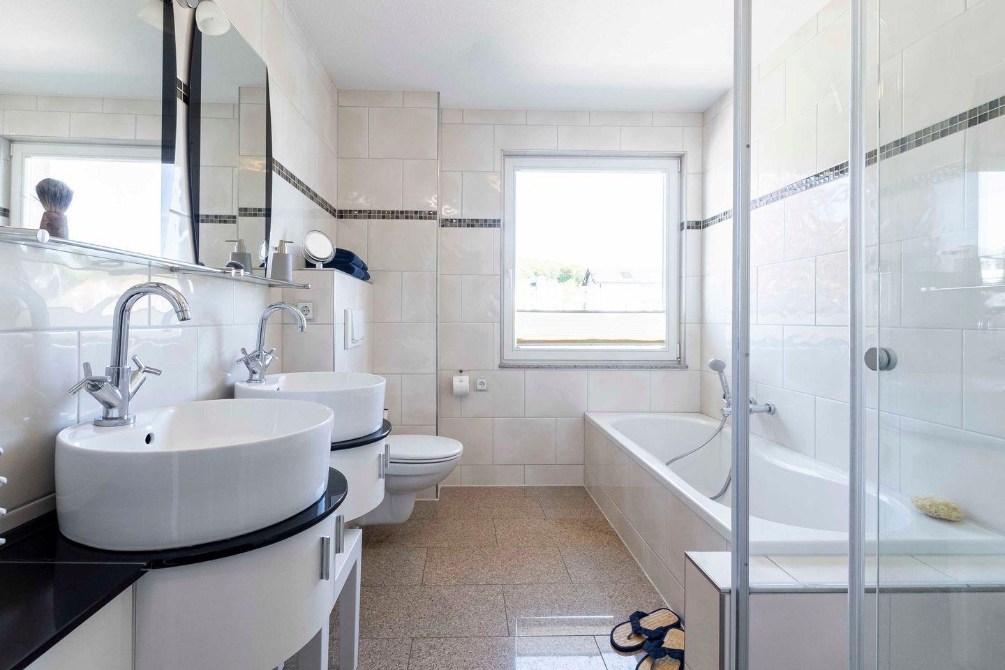 Unsere Gäste haben Zugang zur gesamten Ferienwohnung inklusive Wohnzimmer, zwei Schlafzimmern mit Balkon und Meerblick, dem großzügigen Badezimmer mit Dusche und Badewanne sowie einem separaten WC im Saunabereich.