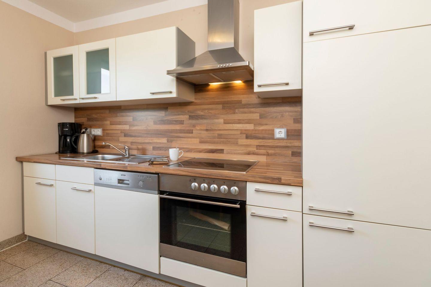 - Voll ausgestattete Küchenzeile: Ceranfeld, Backofen, Kühlschrank, Mikrowelle, Filterkaffeemaschine, Geschirrspüler, Küchen-TV