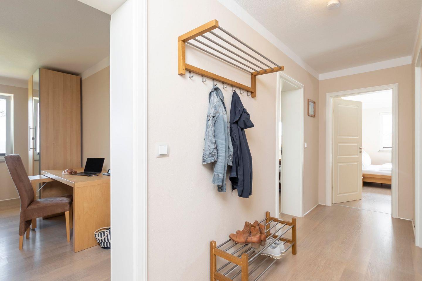 - Schlafzimmer 1: Doppelbett (180 × 200), Kleiderschrank, Nachttische