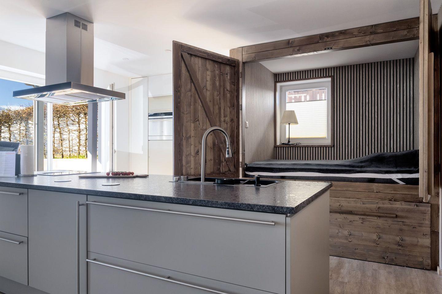 - Gemütlicher Wohn- und Essbereich mit moderner Eckledercouch, Lederstühlen sowie Sitzbank und ausziehbaren sowie höhenverstellbarem Esstisch und traumhaften Meerblick