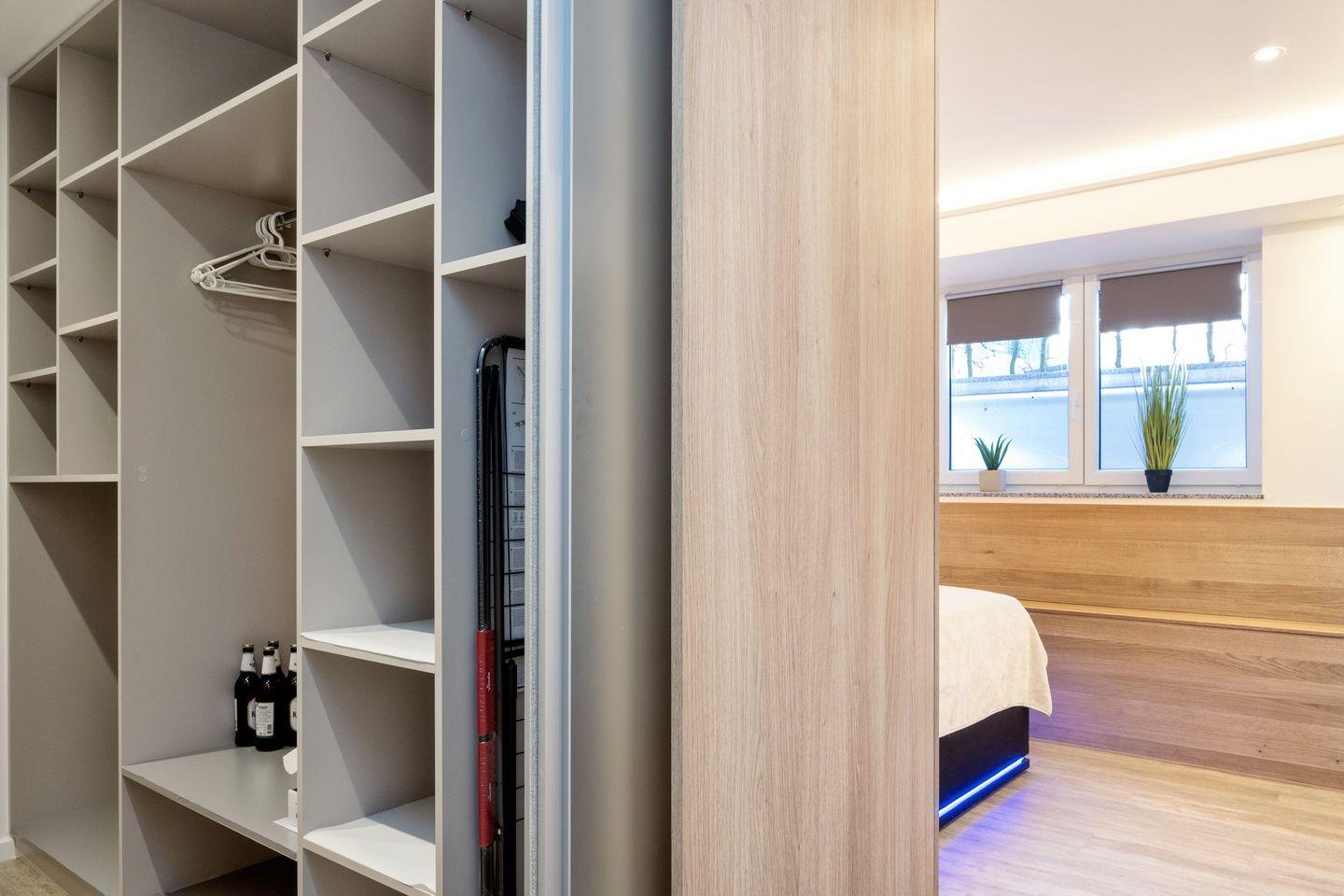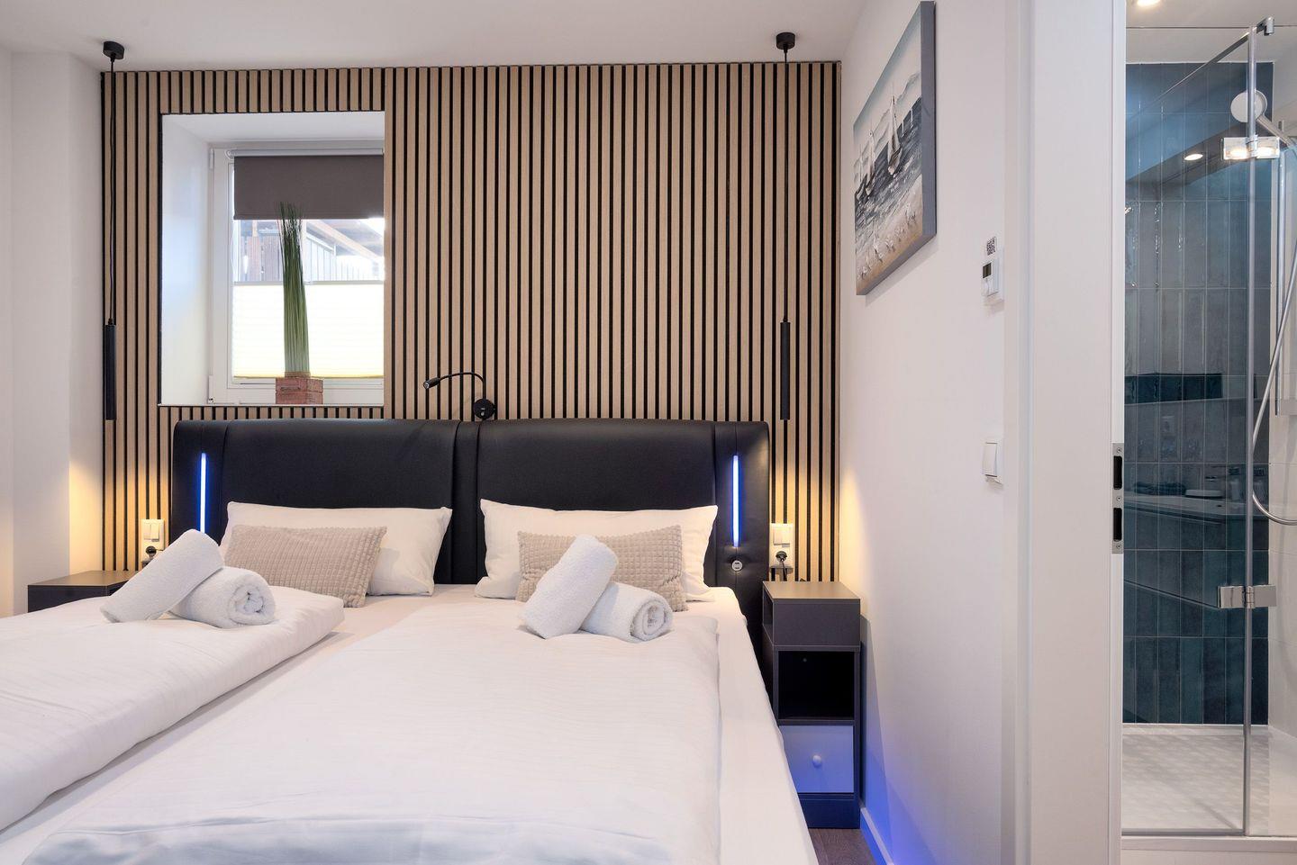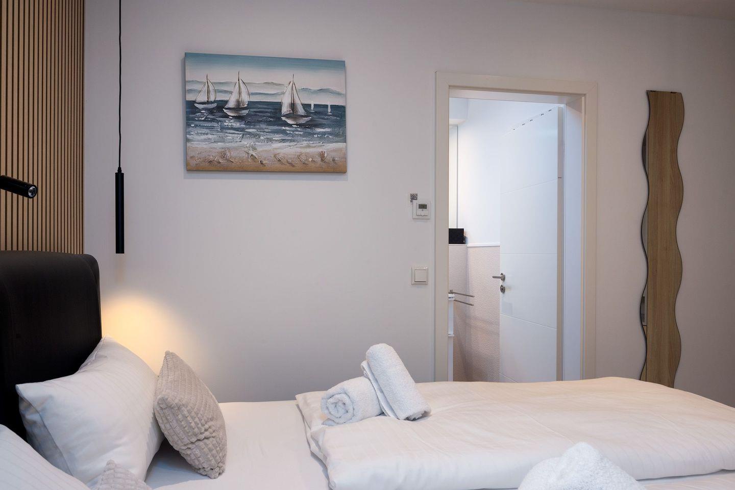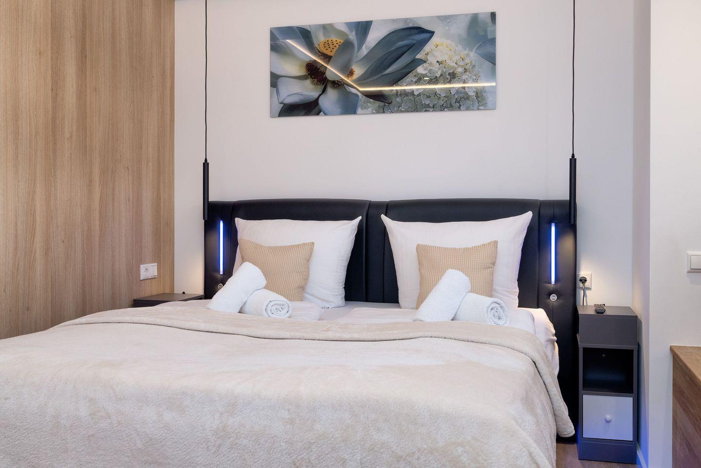 - 2 separate Schlafzimmer, jeweils mit komfortablem Boxspringbett (180x200cm) mit Beleuchtung und Lademöglichkeit für Handy pp. und Flachbild-TV, ein begehbarer Kleiderschrank und dimmbare Ambiente Beleuchtung im vorderen Schlafzimmer.