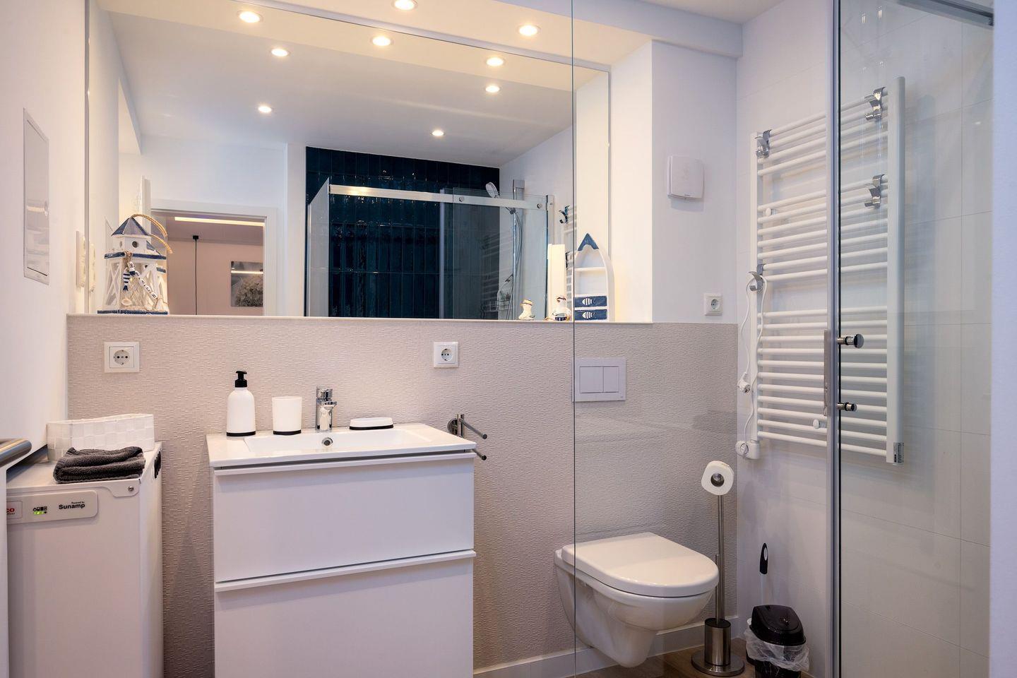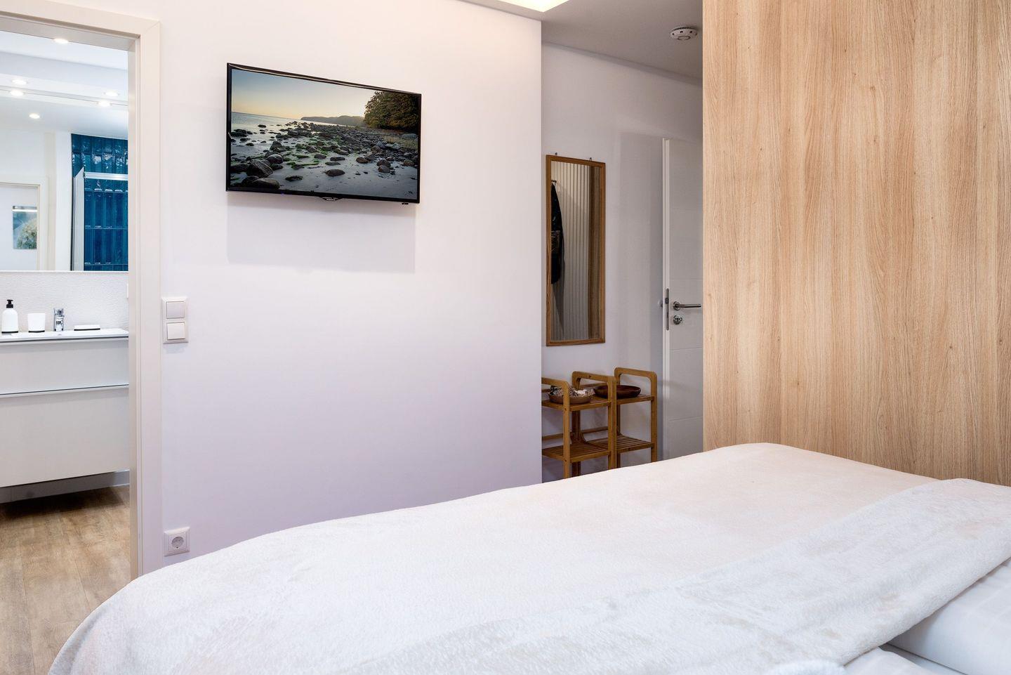 Unsere Gäste haben Zugang zur gesamten Ferienwohnung inklusive Wohnzimmer, zwei Schlafzimmern mit Balkon und Meerblick, dem großzügigen Badezimmer mit Dusche und Badewanne sowie einem separaten WC im Saunabereich.