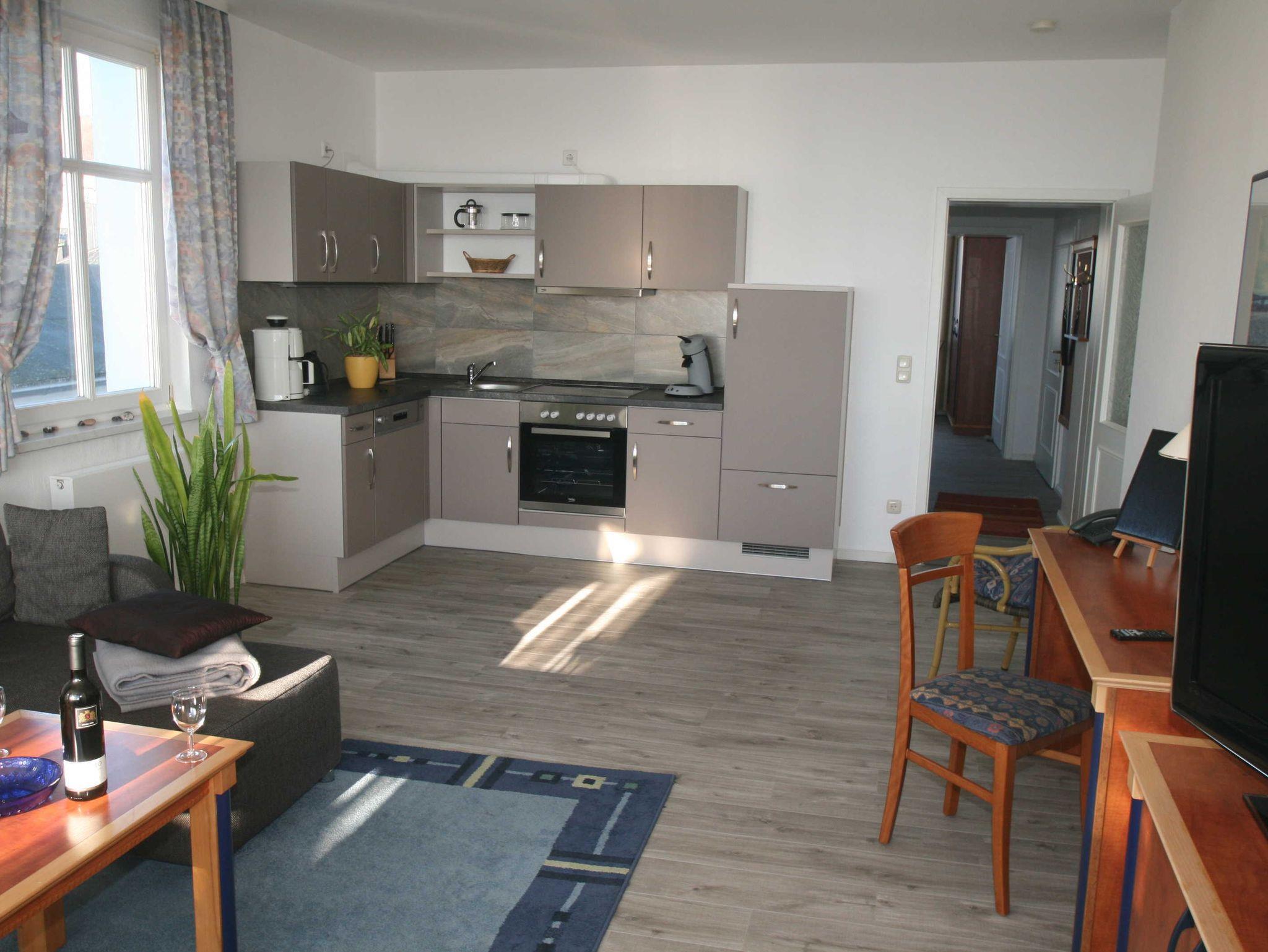 Im Wohnzimmer befindet sich ein Schreibtisch, eine gemütliche Wohnlandschaft, die dann auch für 2 Aufbettungen genutzt werden kann, einen grossen Flatscreen-TV und eine Multifunktionanlage, mit der Sie auch CD' s & DVD's abspielen können. Wir leihen Ihnen auch gerne eine DVD über die schöne Insel Rügen aus.