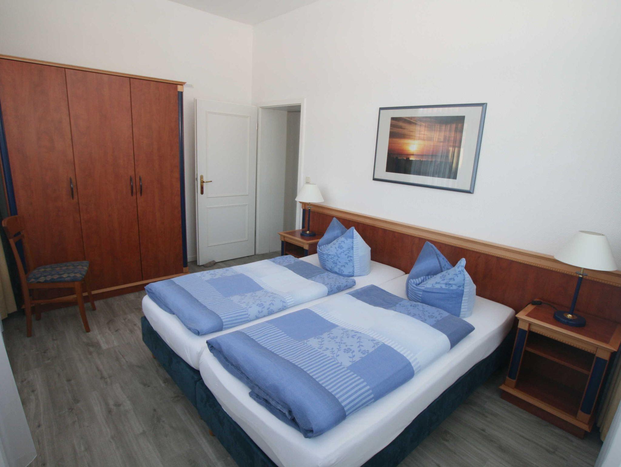 Unsere Appartements des Typ 1 bestehen aus zwei Schlafzimmern. In einem ist ein Doppelbett (1,80x2,00m) , zwei Nachtschränkchen und einen grossen Kleiderschrank.In dem zweiten Schlafzimmer befindet sich ein Bett (90x1,90m), ein Schreibtisch und ein kleiner Kleiderschrank. Ein Bad mit Dusche ist vorhanden. Fön, Handseife und Toilettenpapier stellen wir für Sie bereit. Bettwäsche und Handtücher sind im Preis schon enthalten.