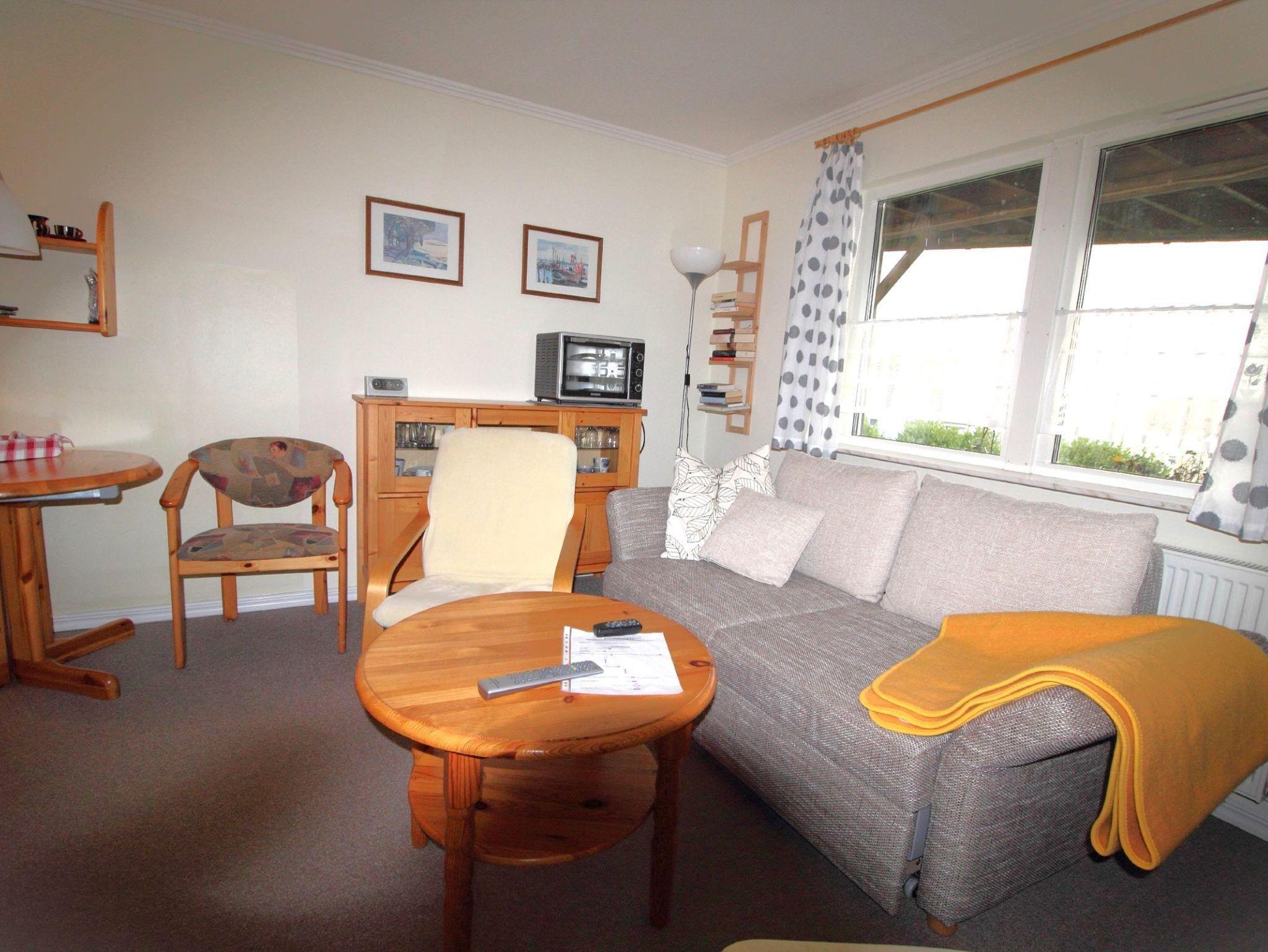 • Das Wohnzimmer bietet ein Schlafsofa (Aufbettungsmöglichkeit für max. 2 Pers.), Radio, TV, CD-/ DVD-Player und Telefon