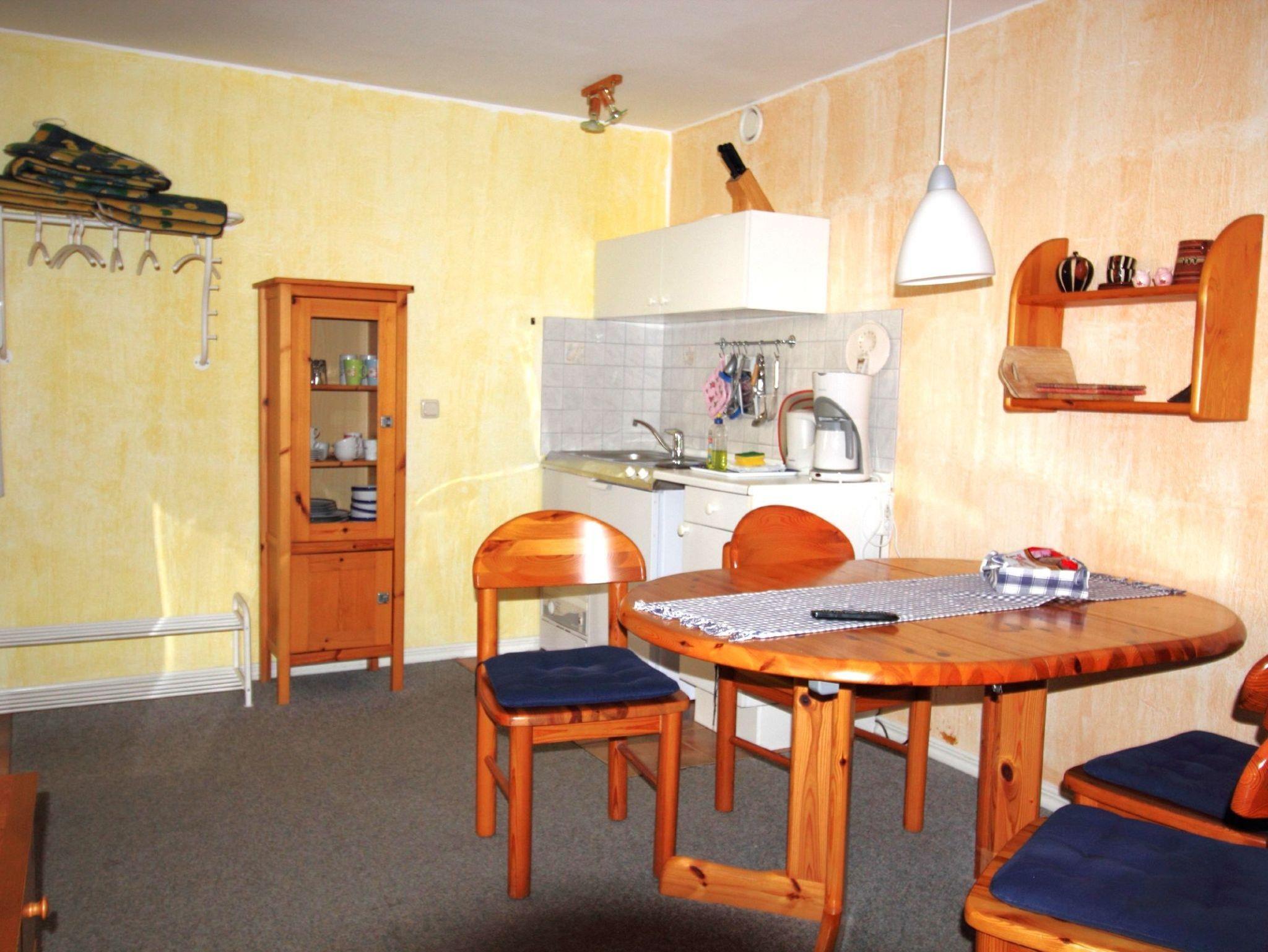 • Die kleine Küchenzeile ist offen zum Wohnraum und bietet ein 2-Platten-Herd, Kühlschrank, Kaffeemaschine eine Geschirrspülmaschine