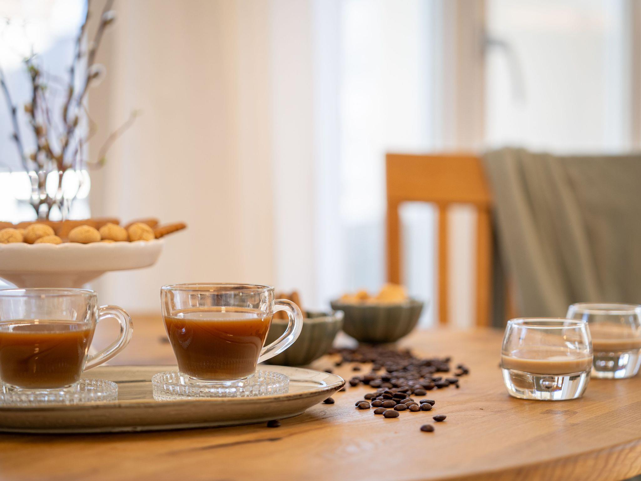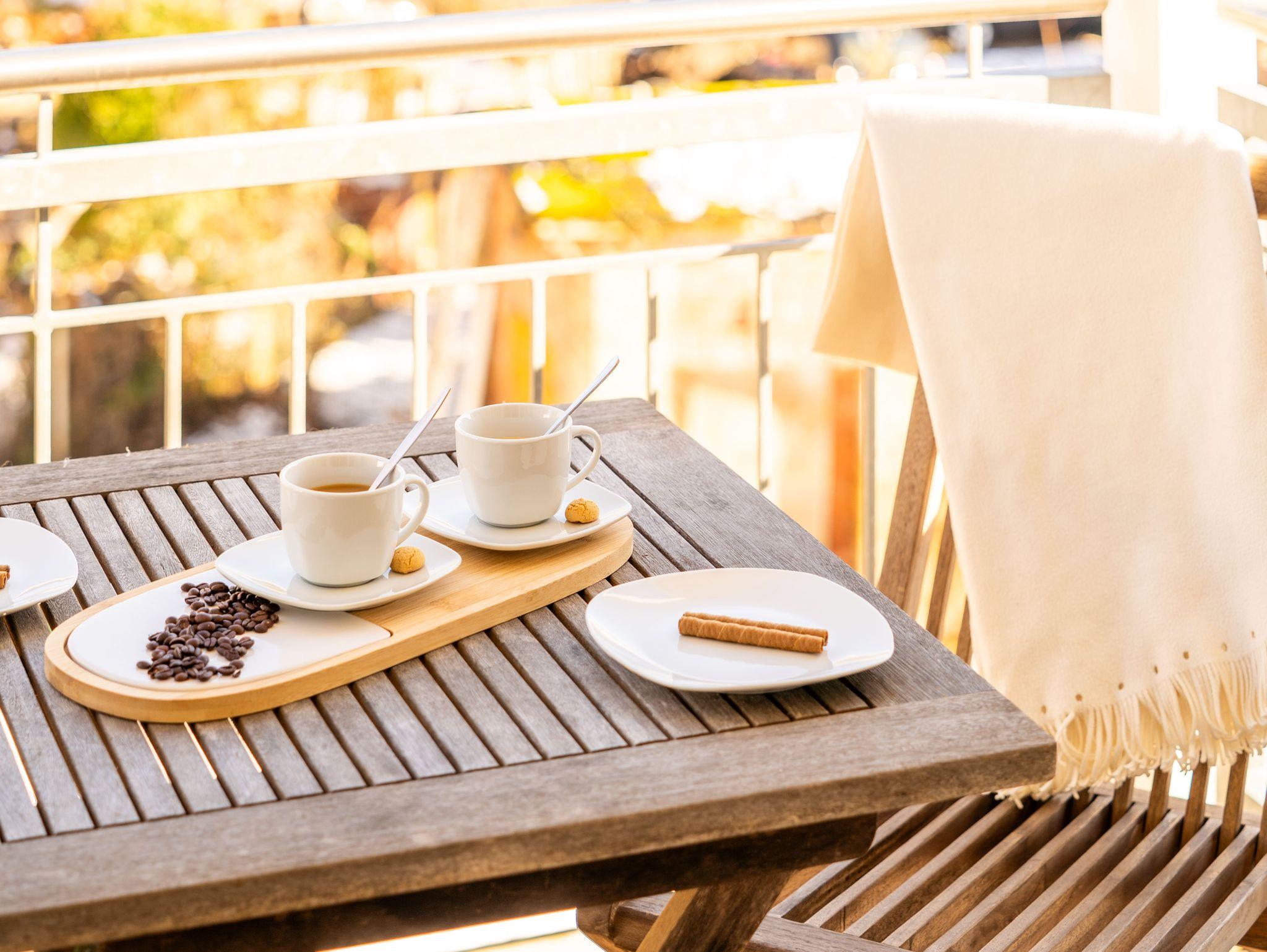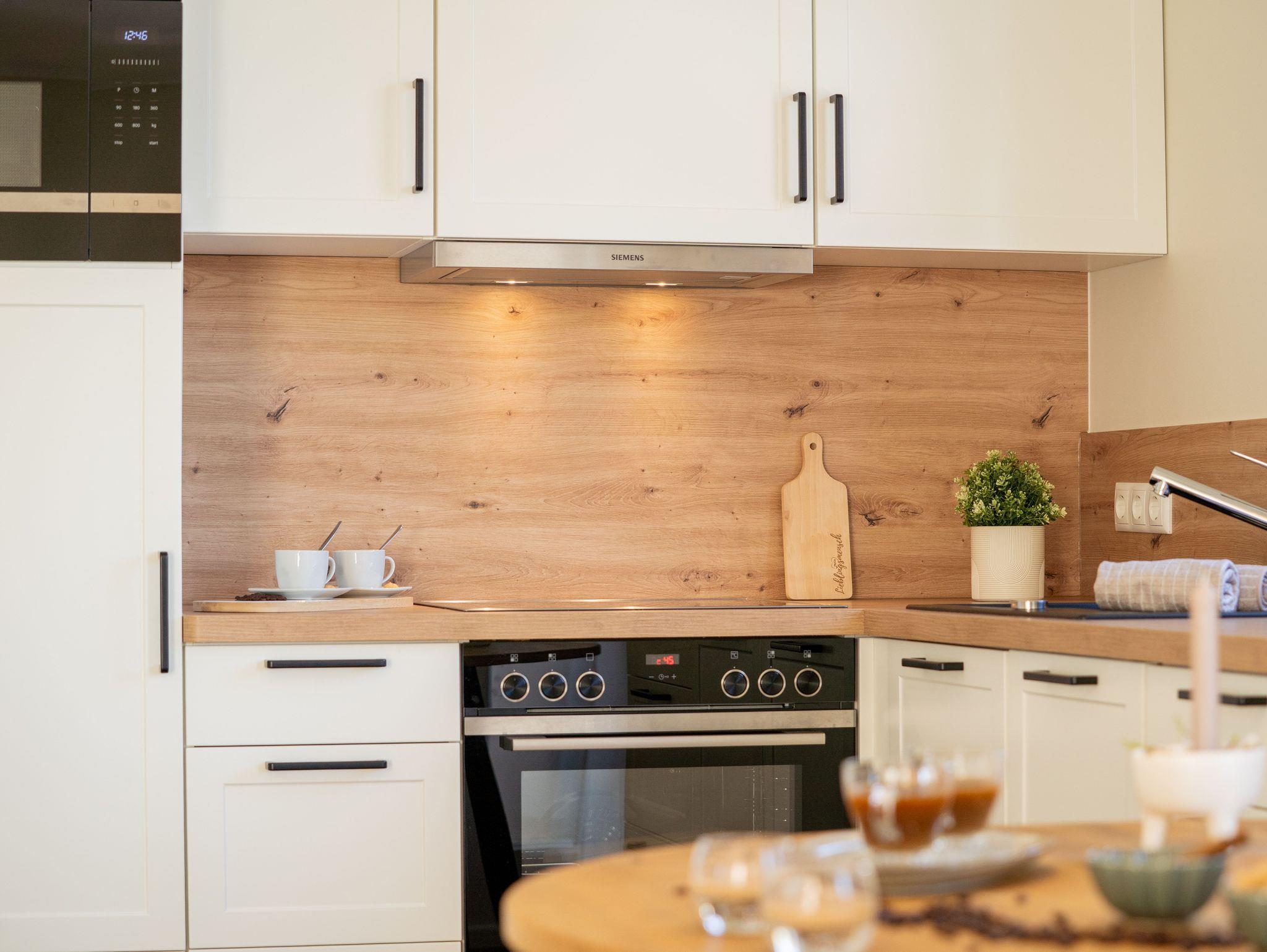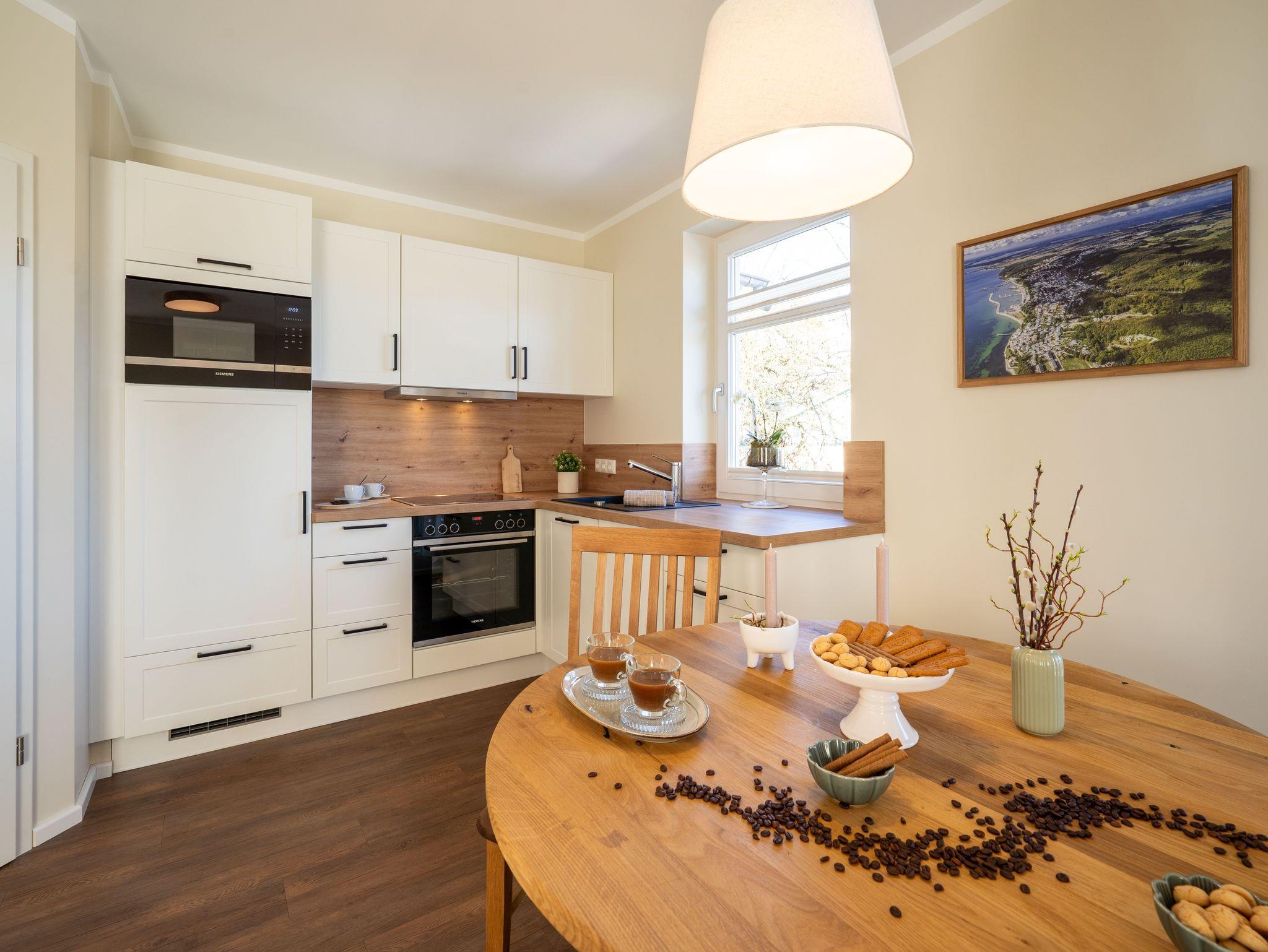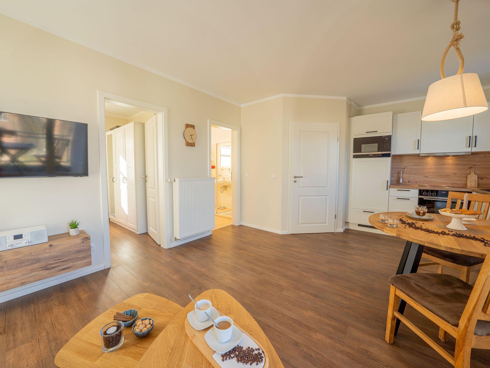 Wohnzimmer mit bequemer Schlafcouch, Smart-TV-Fernseher (SAT-TV), Kompaktstereoanlage mit Radio, CD und DAB+, Einbauküche mit gehobener Ausstattung sowie Ceranfeld, Backofen, Geschirrspülmaschine, Mikrowelle, Dunstabzug und Kühlschrank, Schlafzimmer mit Doppelbett (1,60 m x 2 m), Kleiderschrank, 2 Nachttischen, Großzügiges Badezimmer mit ebenerdiger Dusche, WC, Haartrockner, Kosmetikspiegel, Handtuchheizung, Fußbodenheizung, Balkon Ost mit seitlichem Blick zur Ostsee, Balkon Süd mit direktem Seeblick und Blick über den Alten Markt - ausgestattet mit Teakholzmöbeln.