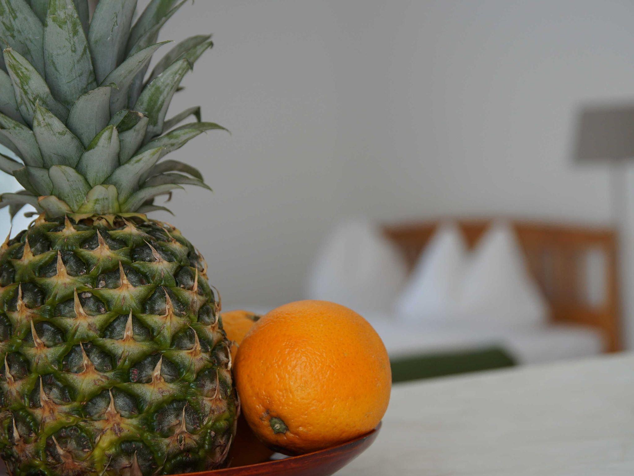 Wohn- Schlafraum ist ausgestattet mit einem Doppelbett (180 x 200 cm), Nachttischschränke mit Nachttischlampen, Kleiderschrank, Sitzcouch, Tisch, Kabel-TV Flat Screen und separater Blu-ray Player, Stereo Musikanlage mit CD Player, Bluetooth und USB für MP3.