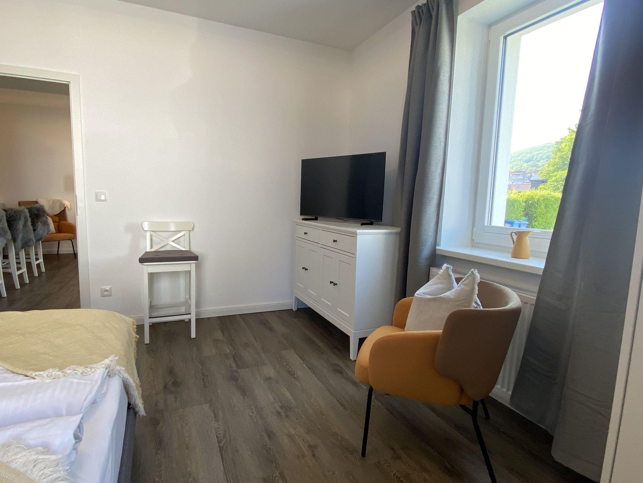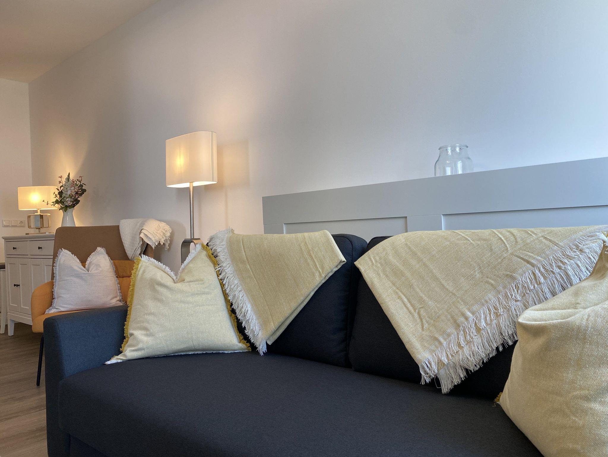 Im Wohnzimmer eine super bequeme Bruno-Schlafcouch mit Taschenfederkernmatratze zum ausziehen und einer Liegefläche von 180 x 200 cm. TV, Ohrensessel und Stubentisch laden zum verweilen ein.