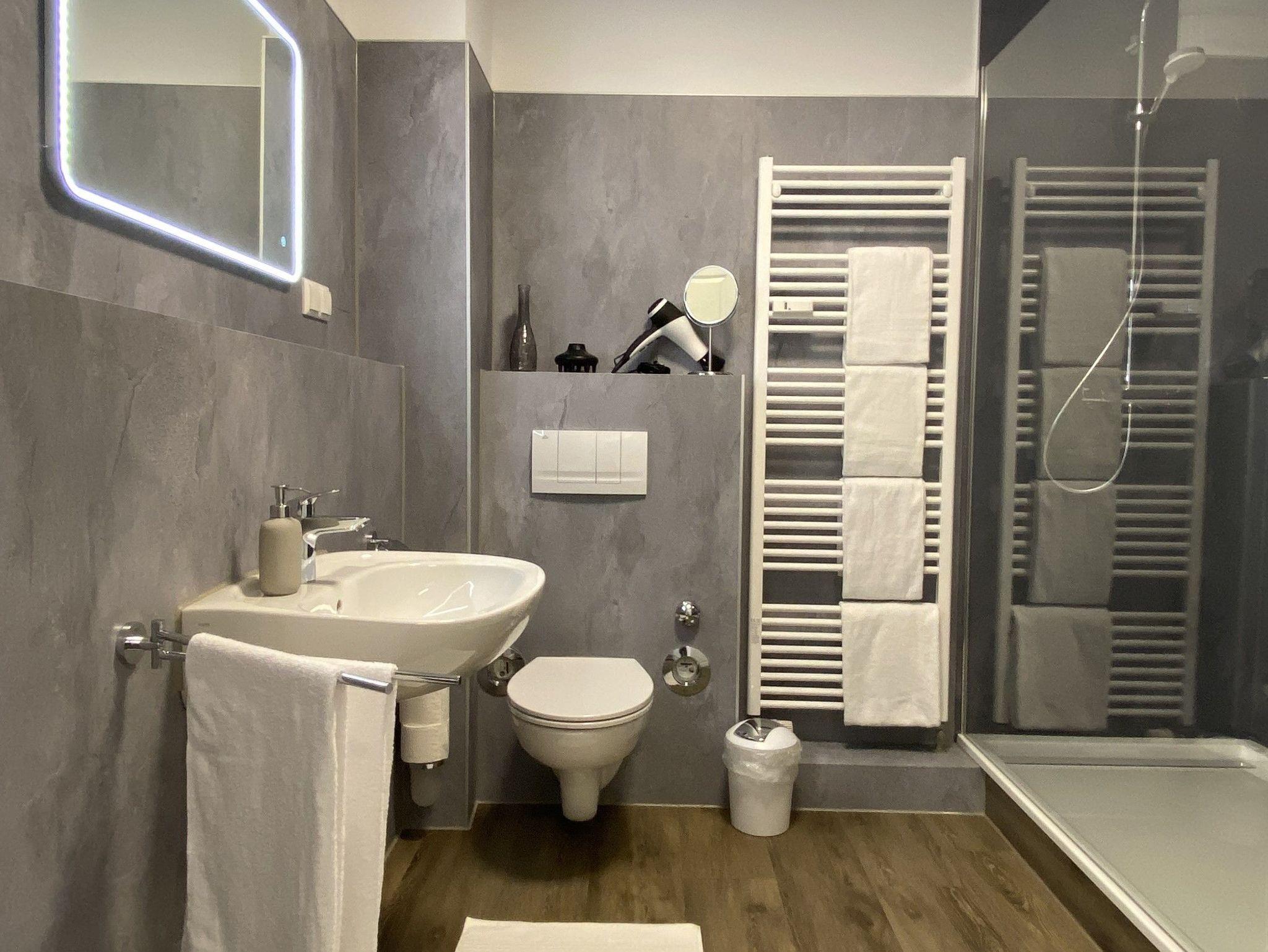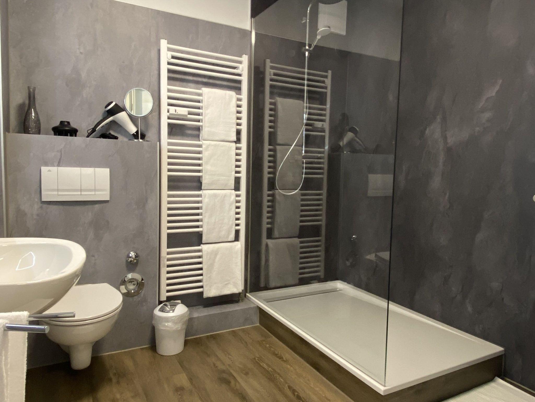 Flur und großzügiges Bad mit Regendusche.