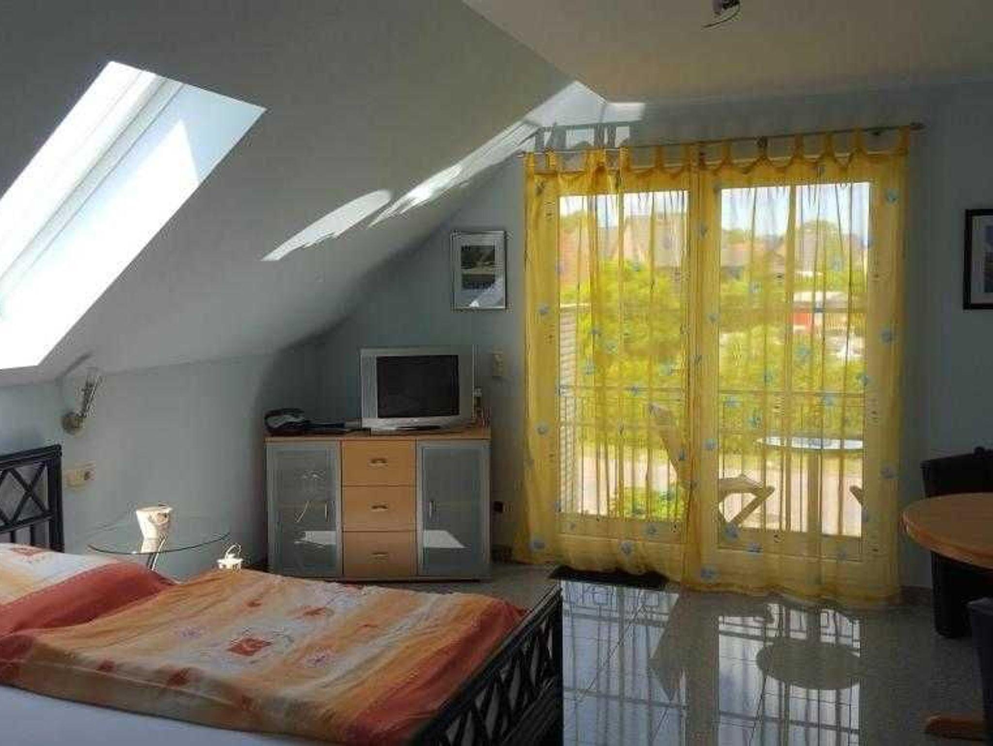 Sat-Flachbild-TV, Radiowecker und elektrische Rollläden vor den doppelflügeligen Balkontüren.