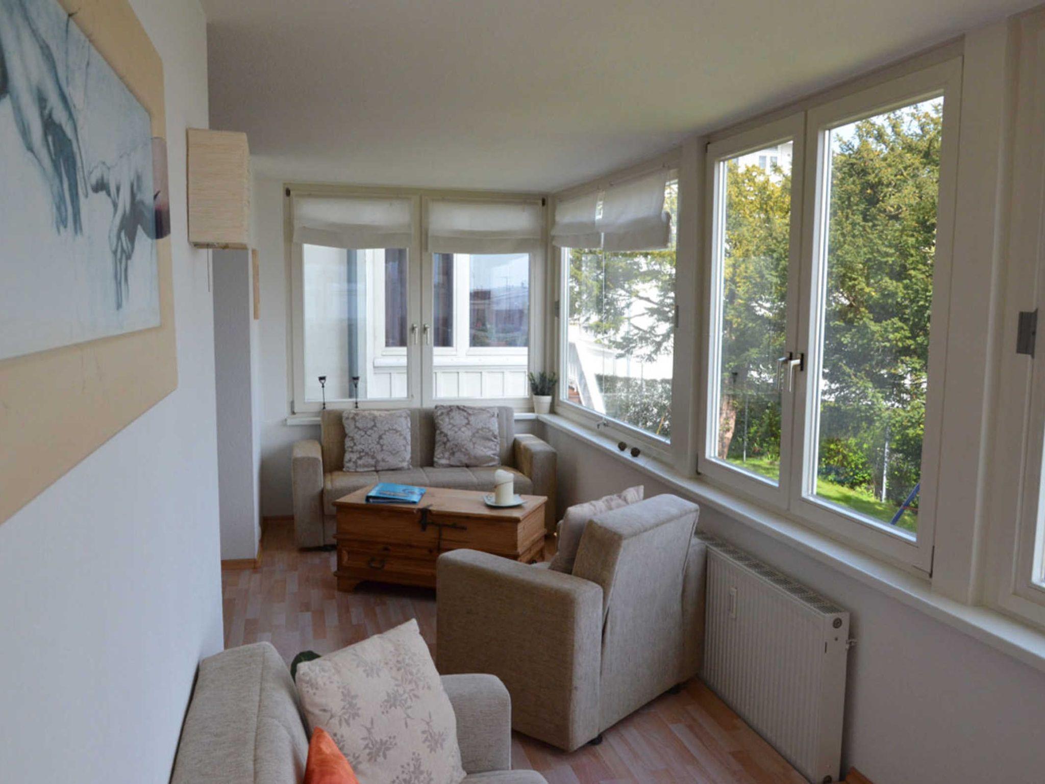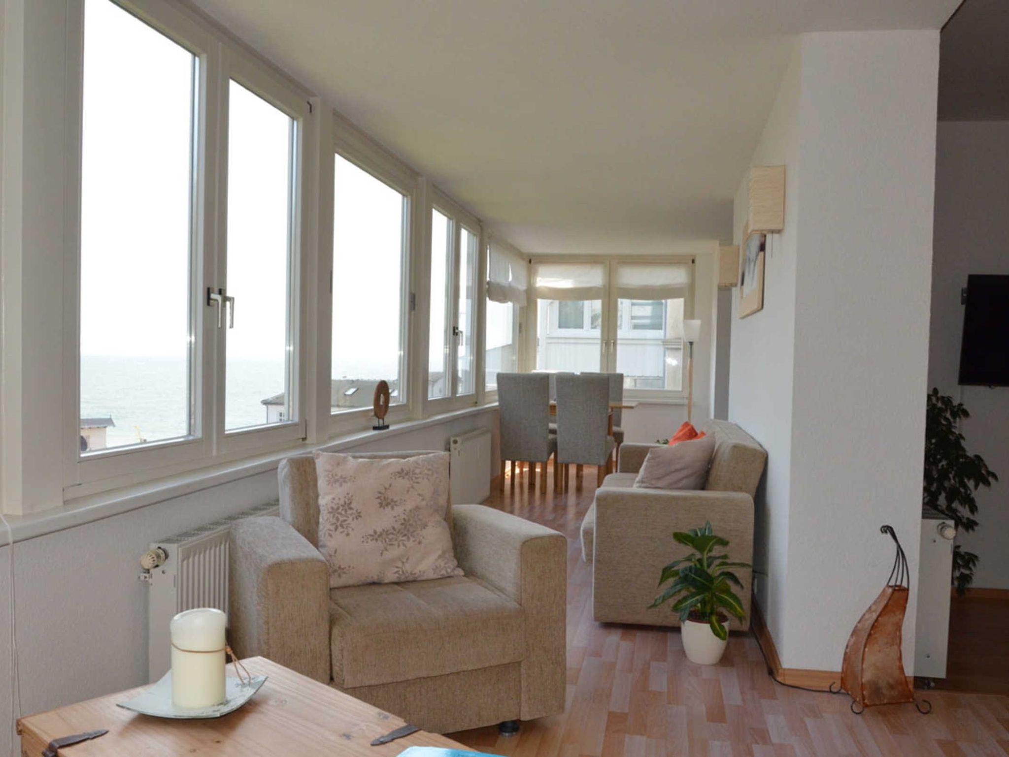 Die moderne und großzügige Ferienwohnung ist ungefähr 90 m² groß. Der separate Schlafraum ist ausgestattet mit einem Doppelbett, ein zweites Zimmer ist ausgestattet mit einer Doppelbettcouch. Das große Wohnzimmer mit gemütlicher Sitzecke und einem großem Flachbildschirm, lädt zum verweilen ein. Genießen Sie den herrlichen Blick auf das alte Sassnitz und die Ostsee, das können Sie vom verglassten Balkon aus auf sich wirken lassen.