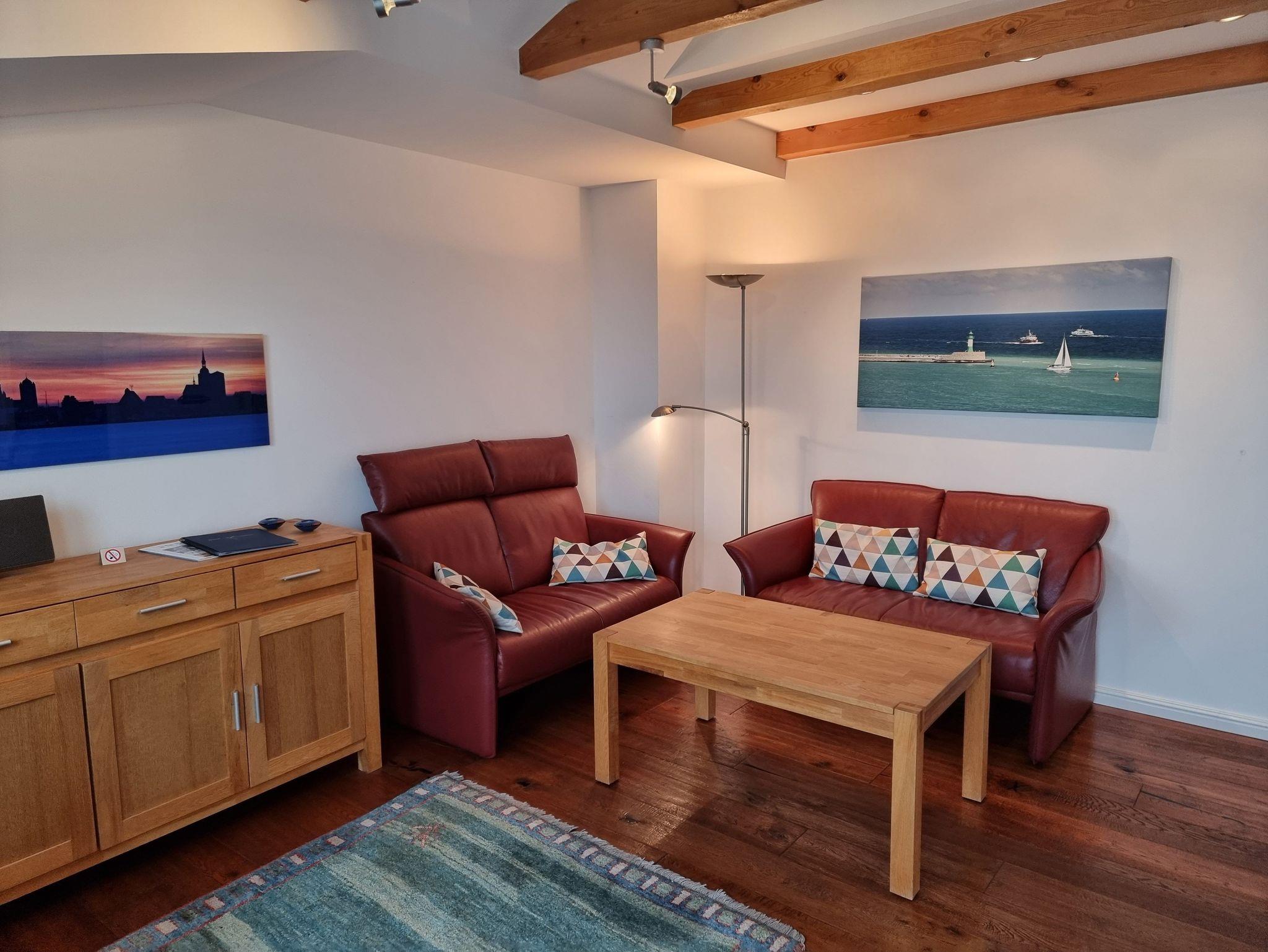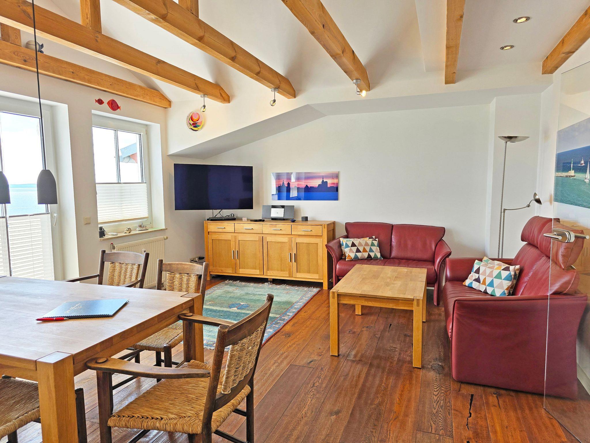 Die gemütlich und modern eingerichtete 3-Raum-Ferienwohnung besteht aus einem Wohnraum mit separater Sitz- und Eßecke, TV, WLAN, Radio und CD-Player. Vom Wohnzimmer aus erreichen Sie den großen Balkon, dieser lädt zum Verweilen ein. Sie genießen einen herrlichen Seeblick und können die Schiffe beim Ein- und Auslaufen im Stadthafen beobachten. Der Balkon ist ausgestattet mit Sonnenmöbel und einer elektrischen Markise. Die zwei separaten Schlafräume sind jeweils mit einem Doppelbett ausgestattet. Das neue Badezimmer bietet eine große Dusche, Waschtisch mit Spiegelschrank und Toilette. In der separaten Küche haben Sie die Möglichkeit sich selbst zu verpflegen. Hier befindet sich ein Herd mit Backofen, eine Spülmaschine, eine Mikrowelle und natürlich alles was dazu gehört.