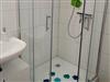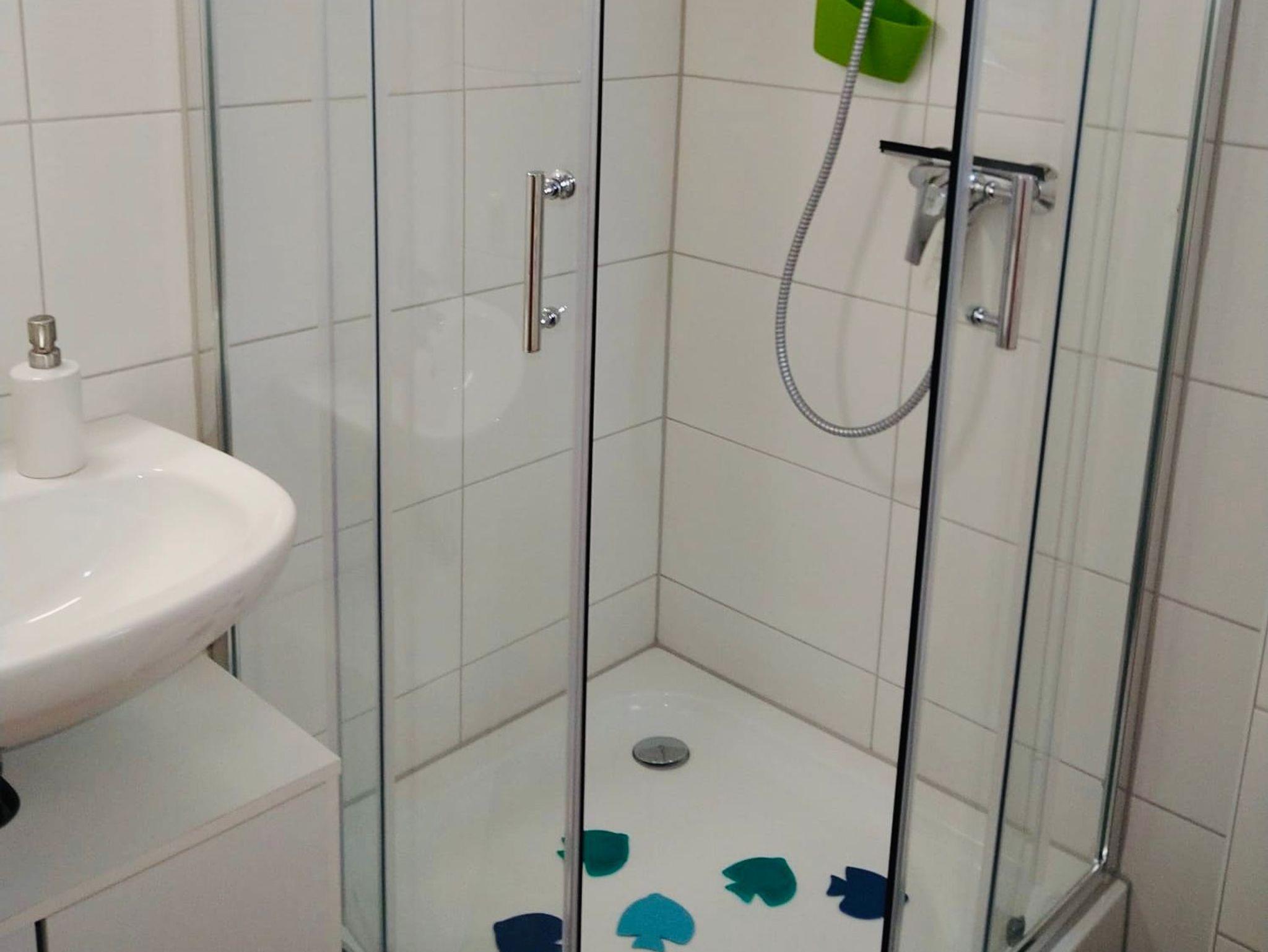 ? Badezimmer mit Dusche, WC, Fön und Handtuchwärmer.