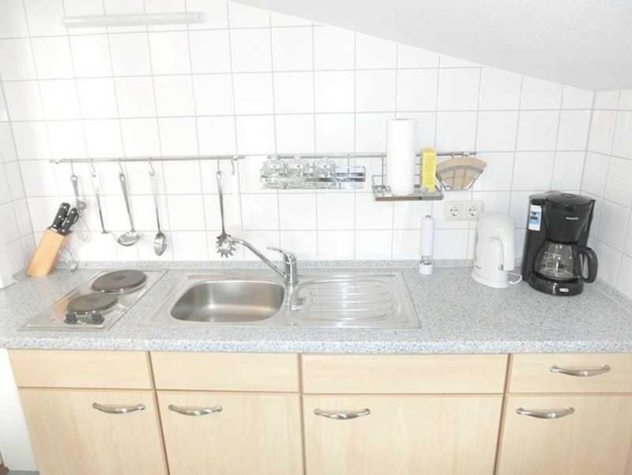 * offene Küche mit einer komplett ausgestatteten Küchenzeile