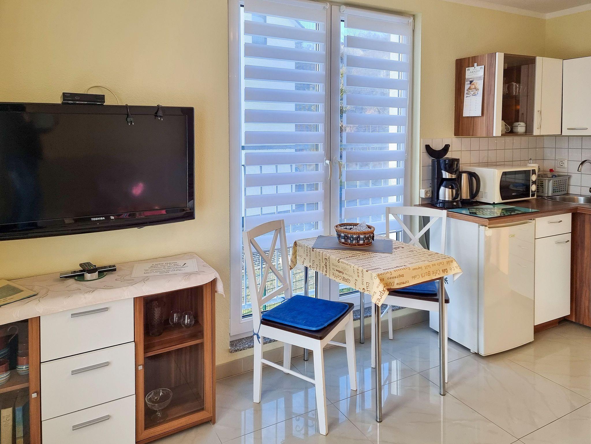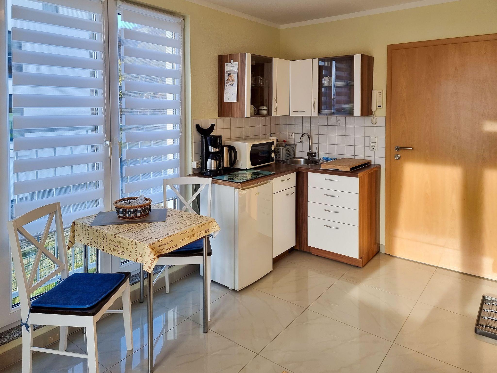 • Die Küchenzeile ist offen zum Wohnraum und verfügt über ein 2-Platten-Ceranherd, Mikrowelle, Kaffeemaschine, Wasserkocher, Toaster und Eierkocher.