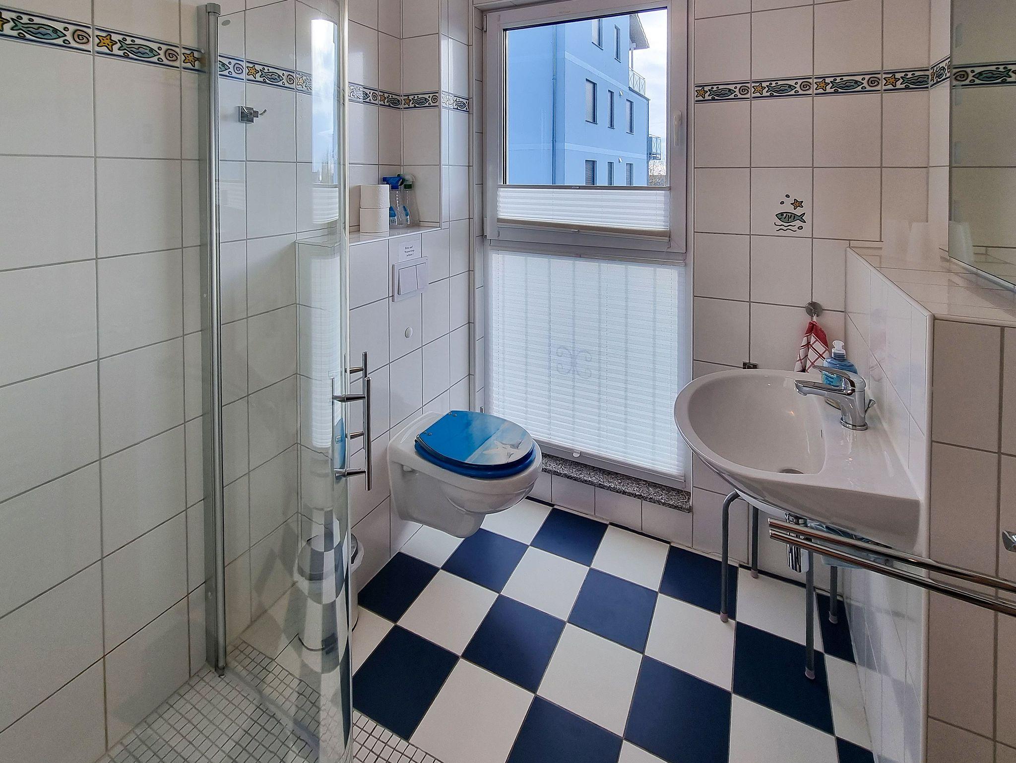 • Das Bad verfügt über eine ebenerdige Dusche, Waschtisch und WC.