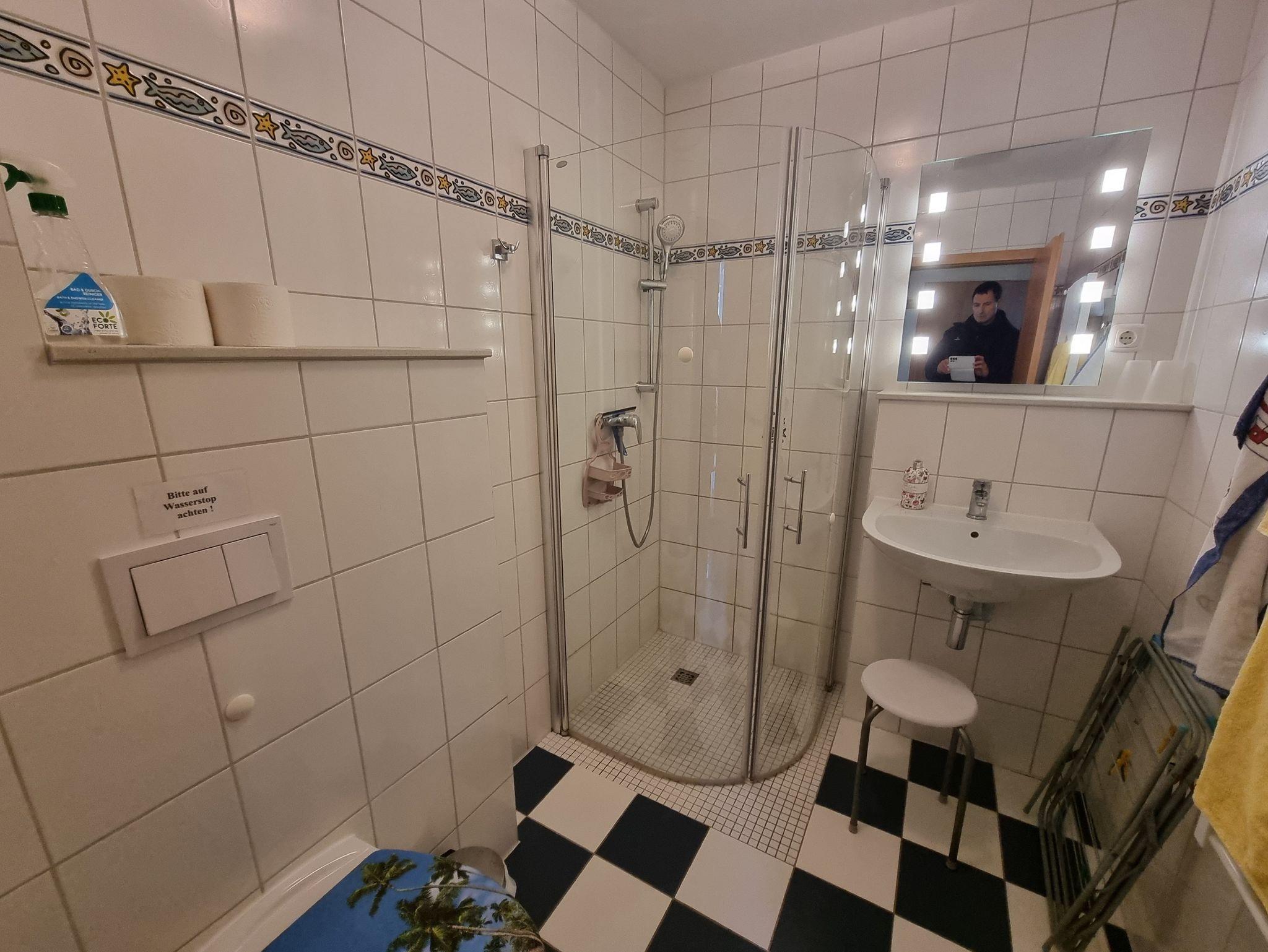 • Das Bad verfügt über eine ebenerdige Dusche, Waschtisch und WC.