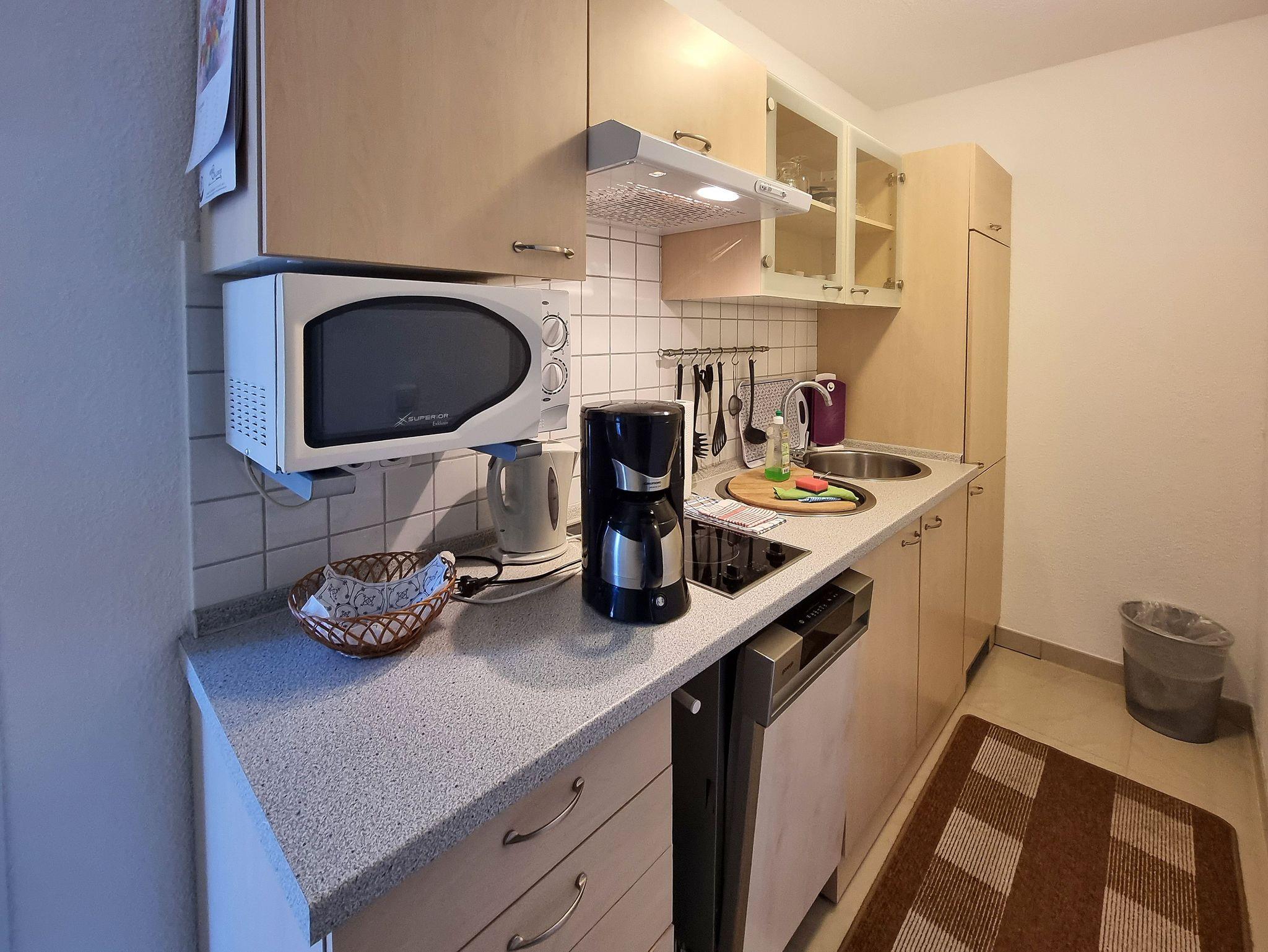 • Im Eingangsbereich befindet sich die Küche. Diese verfügt über ein 2-Platten-Ceranherd, Mikrowelle, Geschirrspüler, Kaffeemaschine, Wasserkocher, Toaster und Eierkocher.